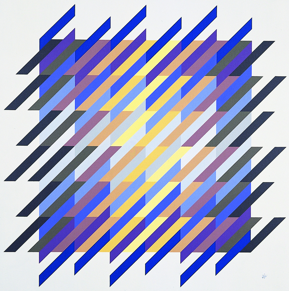 Mit den Worten „Kunst ist universell“ beginnt van Doesburg dieses Manifest und bezieht die Universalität ausdrücklich nicht nur auf die Rezeption von Kunst, sondern auch auf die Produktion. „Die Technik muss mechanisch sein“, legt er ein paar Sätze später nach. Dementsprechend verneinen die meisten konkreten Maler individuellen Duktus oder gar gestische Expressivität. An deren Stelle treten Kompositionssysteme. So entsteht eine unterkühlte, intellektuelle, oft tatsächlich nahezu mechanische Kunst, die sich nicht selten unbestechlichen mathematischen Prinzipien unterwirft. Das Gemälde „Fünfzehn systematische Farbreihen mit vertikaler und horizontaler Verdichtung“ (1950/1967) des Zürcher Künstlers Richard Paul Lohse ist dafür in Würzburg ein prägnantes Beispiel. Und dann gibt es die Gegentendenz, bei der Künstler kleinere Ausbrüche aus der geometrischen Logik wagen. Anton Stankowski – der als Werbegrafiker 1974 das Logo der Deutschen Bank entwarf – lässt bei seinen „Schrägen Violett und Gelb“ (1975) menschliches Maß durch wohltuend aufgehelltes Kolorit erkennen und gaukelt dem Auge zudem ziemlich unwissenschaftlich Quadratformen vor, wo keine sind. Und ein Maler wie FranÇois Morellet brachte 1962 glatt den Zufall ins Spiel, als er die winzigen gelben und grauen Quadrate auf seiner Leinwand gemäß der Nummernfolgen anordnete, die ihm seine Verwandten aus dem Pariser Telefonbuch vorlasen.