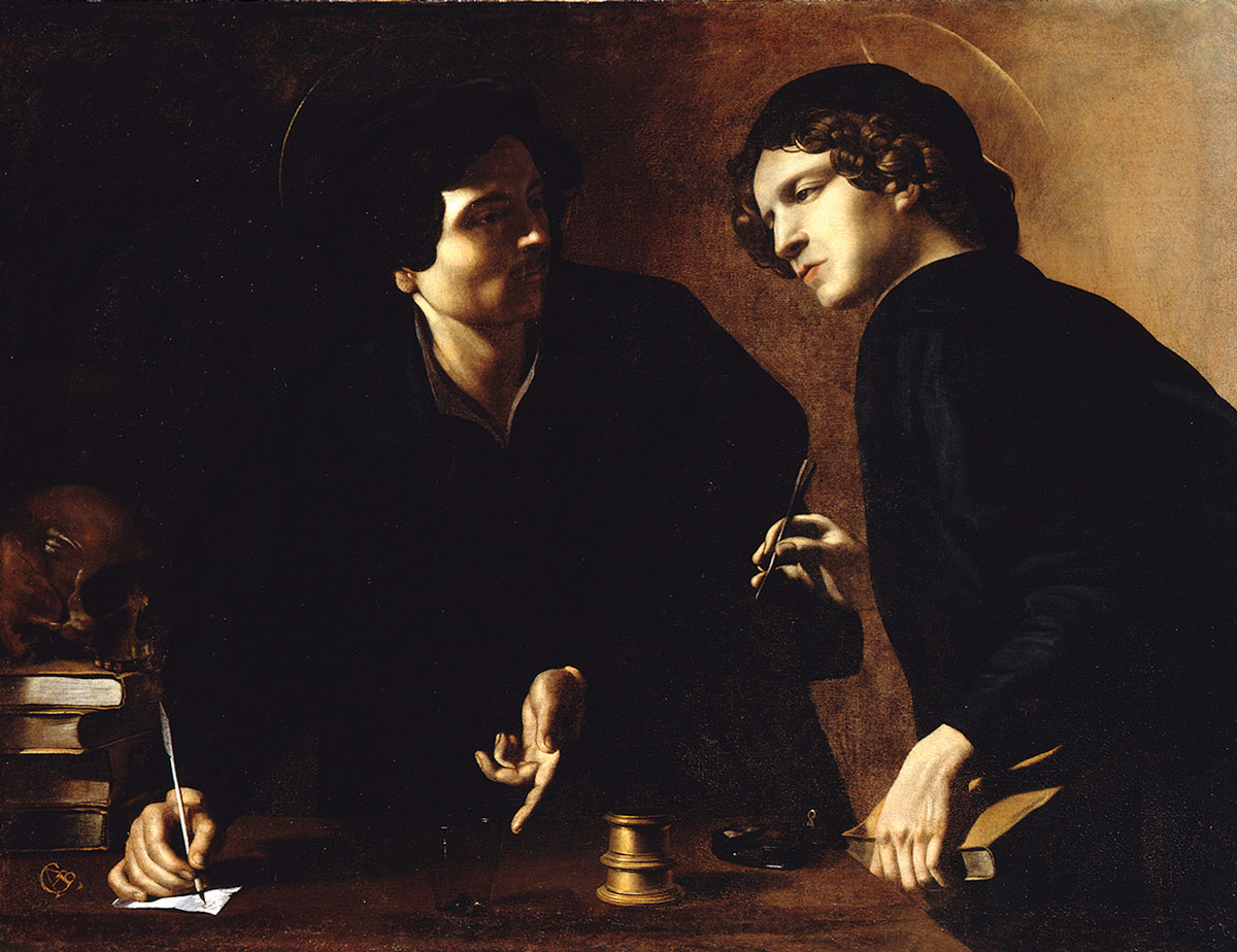 Battistellos Bildaufbau ist typisch für die neapolitanische Kunst nach Caravaggio: einfach und kompliziert zugleich. Das Licht kommt wie von einem Scheinwerfer am Boden von links unten, wodurch das Gesicht der linken Figur fast komplett verschattet wird. Da beide Schwarz tragen und sich die Farbpalette auch sonst auf erdige Brauntöne beschränkt, lenkt nichts ab von der Hauptsache im Bild: dem Ballett für vier feingliedrige Pianistenhände und zwei jugendlich-ernste Antlitze, das der Maler hier aufführt. Es ist das Sichzudrehen und Voneinanderabwenden zweier Menschen im angeregten Gespräch, unterbrochen von Phasen des Nachdenkens, komprimiert in einem einzigen Augenblick, dem Gemälde. Diese Theatralik erschöpft sich nicht im kunstvollen Effekt. Sie lässt einen unmittelbar teilhaben an der Unterhaltung der beiden – und genau darum geht es ganz grundsätzlich bei den neapolitanischen Künstlern. Lebhafte Gesten und unverstellte, auffordernde Blicke; der Dreck an Fußsohlen und unter den Fingernägeln: Sie dienten dazu, den Betrachtern die Bilder aufzuschließen, ihnen Zugang zu verschaffen und eine Brücke zu schlagen von ihrer Realität zur Realität der Leinwand.