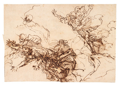 Eine sogar in diesen extravaganten Kreisen ganz und gar einzigartige Figur aber war Salvator Rosa, von dem die Wiesbadener für ihre Ausstellung sieben Zeichnungen und drei Gemälde herbeischaffen konnten. Eines davon, die „Landschaft mit Soldaten“, wurde erst kürzlich im Zuge der Ausstellungsvorbereitungen als eigenhändiges Werk des Künstlers identifiziert. Rosa, ein gebürtiger Neapolitaner, der die meiste Zeit seines Lebens in Florenz und Rom zubrachte, zählte bereits zur zweiten Generation der Caravaggisten. Ihm wurde postum alles Mögliche angedichtet, von der Beteiligung am Masaniello-Aufstand bis zu einer geheimen zweiten Laufbahn als Räuber und Bandit.
