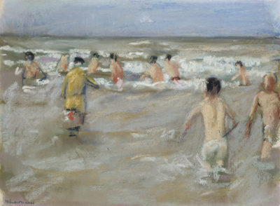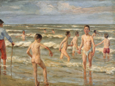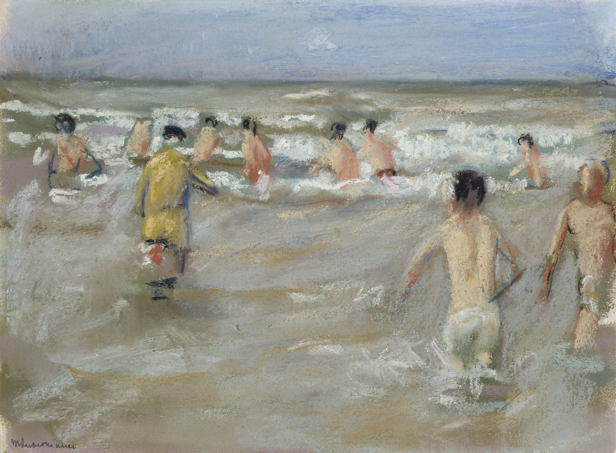 Dass er sich zur Jahrhundertwende neuenThemen zuwandte, mag mit seiner Tochter zusammenhängen. Und mit Scheveningen, seit 1900 seinem neuen Sommeraufenthalt. Denn vor dem Hotel d’Orange, wo er zu wohnen pflegte, gab es seit 1899 einen Rasenplatz, auf dem Tennis gespielt wurde. Und seine Tochter Käthe, damals 15, nutzte eifrig die Gelegenheit. „Sie ist nicht allein zum Vergnügen auf der Welt, auch kann sie nicht den ganzen Tag Lawntennis spielen“, schrieb er deshalb mahnend an seine Frau. Ob Käthe Liebermann, die später Kurt Riezler, den Diplomaten und Verfasser umstrittener Tagebücher, heiratete, damals bereits dem Reiten huldigte, bleibt offen. Liebermann malte sie erst 1913 zu Pferde. Aber dass er in Scheveningen die Reiter als Motiv entdeckte, verrät ein Brief an Franz Servaes: „Was mich persönlich betrifft, so bin ich in eine neue – die wievielte weiß allein der liebe Gott und Rosenhagen – Periode getreten: in den drei Monaten, die ich jetzt in Holland war, habe ich mich wieder gehäutet, male Pferde und nackte Weiber (aber nicht auf Pferden).“ Zehn Reiterbilder malte er allein 1900. Und in den folgenden Jahren kamen mal mehr, mal weniger dazu.