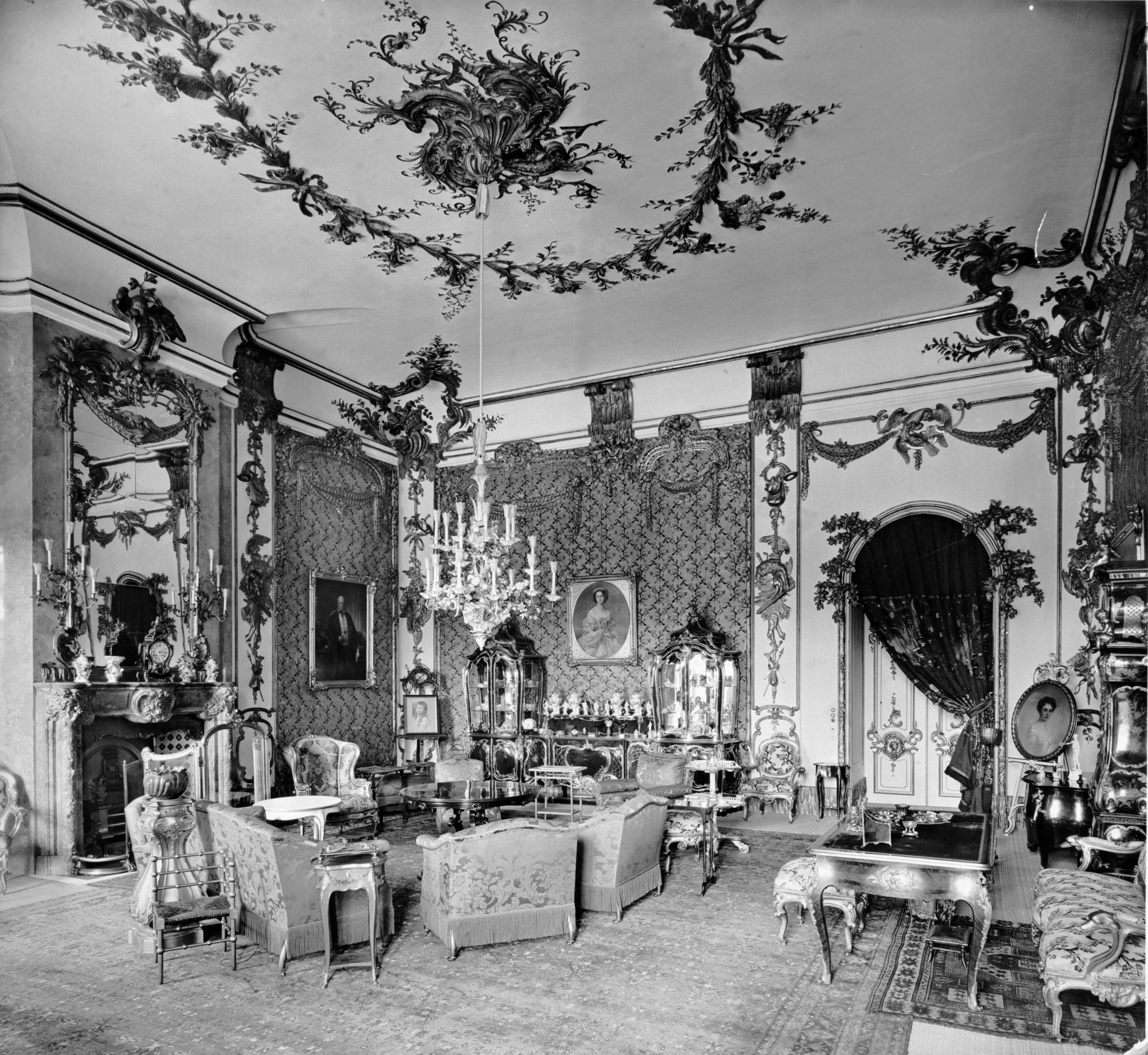 Eine festlich gedeckte Abendtafel, kaiserliches Tafelsilber und kostbare Porzellane zeigen die Requisiten des kaiserlichen Exil-Lebens. Der neubarocke Schreibtisch des Kaisers steht wieder an seinem Platz, auch der große Juwelenschrank der Kaiserin kam nach Potsdam. Ein Großfoto zeigt die zahlenstarke „Kaierliche Familie auf den Stufen des Neuen Palais“, 1913. Dazu kommen Brotmarken des „Steckrübenwinters“ und ein von Revolutionären zertretenes Porträt Kaiser Wilhelms II. – Relikte, die Authentisches zu den Schattenseiten der Revolutionszeit vermitteln.