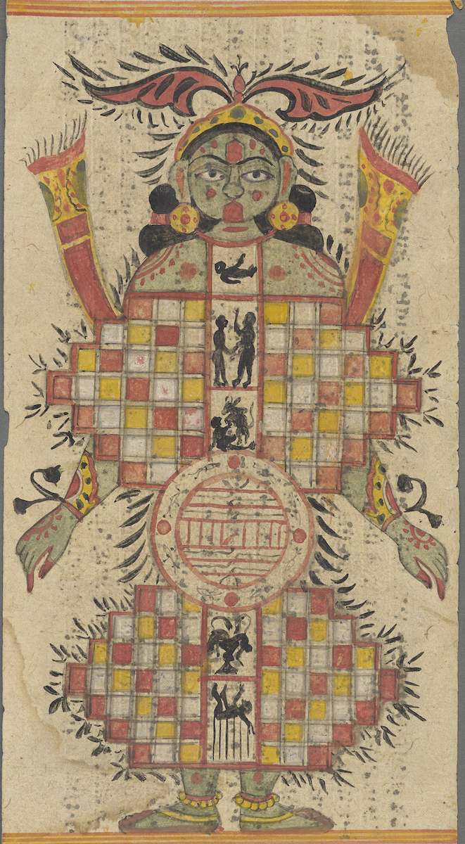 Das geschieht in einer der sieben Höllen im Unterleib von Lokapurusha, dem kosmischen Menschen als Abbild der Welt – stets als Frau dargestellt. Die Körpermitte, eine Scheibe, ist der Ort der Lebenden: der Menschen, Tiere und Pflanzen. Und darüber – unter dem Kopf – befinden sich die verschiedenen Himmel als Wohnorte der Götter. Diese Götter werden jedoch nicht angebetet. Denn – da bestehen Parallelen zum Buddhismus – die Existenz wird als ein ewiger Kreislauf der Wiedergeburten aufgefasst. Und das Ideal ist, diesen Zyklus aufzubrechen, um des Nirwanas teilhaftig zu werden.