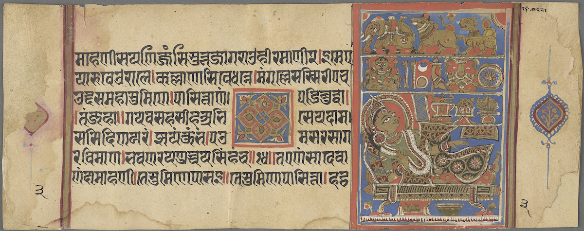 Die Bilder sind keine unabhängigen Kunstwerke. Die Erzählungen vom Leben und Wirken der Tirthankara wollen als Paradigma des rechten Lebens verstanden werden. Dass Neminatha, der 22. Tirthankara, auf dem Weg zu seiner Hochzeit die in einem Gehege lauthals klagenden Tiere, die für das Fest geschlachtet werden sollen, freilässt, seinen Besitz verschenkt und fortan das Leben eines Asketen führt, ist ein solches Beispiel. Andererseits deuten die Szenen mit Devananda und Trishala an, wie tief das Kastenwesen verwurzelt war. Als die Brahmanin Devananda durch 14 prophetische Träume – die in den Miniaturen mit Bildgleichnissen verdeutlicht werden – erfährt, dass sie mit Mahavira schwanger ist, greift Indra ein. Auf seine Weisung wird eines Nachts Devenandas Fötus mit dem Fötus von Trishala, der Frau von König Siddharta (nicht mit Hermann Hesses „Siddhartha“ verwandt) ausgetauscht, weil der Weltenerneuerer aus königlichen Geblüt sein muss.