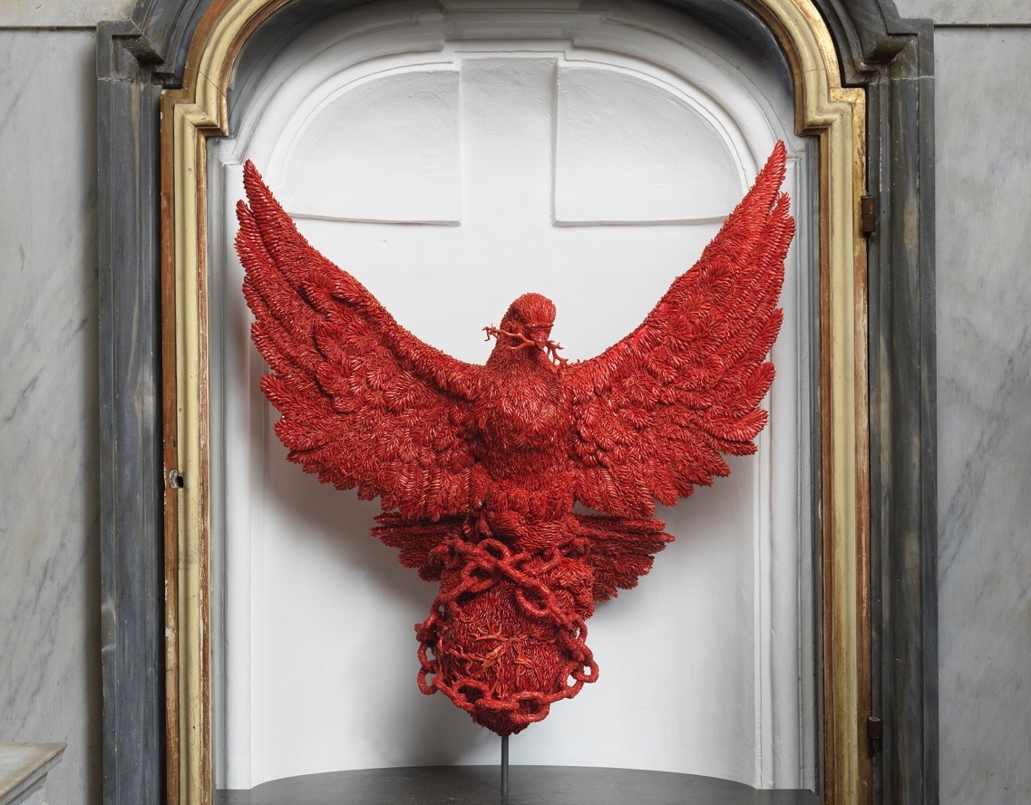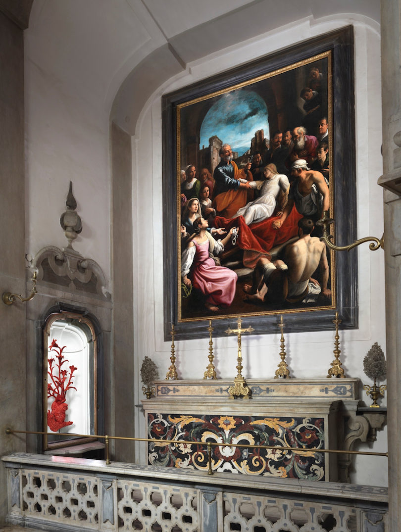 Mehr als das ist in dem kuppelbekrönten Zentralbau zu bewundern – neben Caravaggios Gemälde sechs weitere Altarbilder von gleichfalls bedeutenden Meistern wie Luca Giordano. Seit neuestem sind auch vier Arbeiten des flämischen Künstlers Jan Fabre zu sehen. Über fünf Monate des vergangenen Jahres war bereits eine Skulptur Fabres in der Mitte der Kirche aufgestellt, „Der Mann, der das Kreuz trägt“, Aug‘ in Auge mit dem gekreuzigten Christus auf dem Hochaltar, über dem Caravaggios Darstellung der Tugend-Taten zu sehen ist. Aus dieser temporären Zusammenarbeit resultierte der Wunsch, Fabre mit vier Arbeiten zu beauftragen, die in vorhandenen Nischen der das Kirchenrund füllenden Seitenkapellen unterzubringen waren. Fabre entschied sich für Skulpturen aus roter Koralle, einem im Golf von Neapel gewonnenen – „gefischten“, wenn man so will – und in der Stadt selbst seit Jahrhunderten beliebten Schmuckmaterial, und gespendet wurde das kostbare Material denn auch von den beiden führenden Korallenhändlern der Stadt.