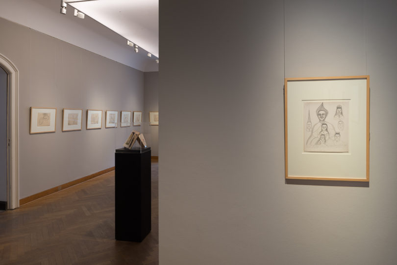 Eine Weltpremiere gibt es in den Räumen der Villa Grisebach außerdem: Zum ersten Mal werden Hilma af Klints Entwürfe für ein Koffermuseum ausgestellt. Um ihre riesigen Leinwände auch außerhalb des Ateliers vorführen zu können, ließ sie die Werke abfotografieren und kolorierte die Aufnahmen anschließend. Von ihrer berühmten Serie „Die Zehn Größten“ (1907) schuf sie auf diese Weise eine Miniaturversion, die nun in den Vitrinen der Ausstellung ruht.