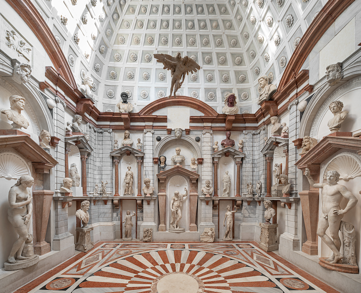 Die Gliederung der marmornen Wanddekorationen mit Pilastern, Ädikulen, Architraven und Rundbögen folgt dem Vorbild der römischen Sammlungen, doch die farbige Gestaltung der kleinen Säulen und des Gesimses mit rotem Marmor verleiht dem Ambiente eine warme Atmosphäre, die mit dem klassischen venezianischen Intarsien-Fußboden harmoniert. Mit weiteren kleinen grünen Farbelementen und grauen Farbabstufungen hat die Tribuna einen theatralen Charakter und ermöglicht jedem der skulpturalen Objekte einen besonderen Auftritt. Bemerkenswert ist die Anordnung der Porträtbüsten, die auf die ursprüngliche Zusammenstellung zurückgeht. Die Figuren stehen untereinander im Blickkontakt, als würden sie imaginär ein Gespräch führen, wie es in Humanistenkreisen gepflegt wurde.
