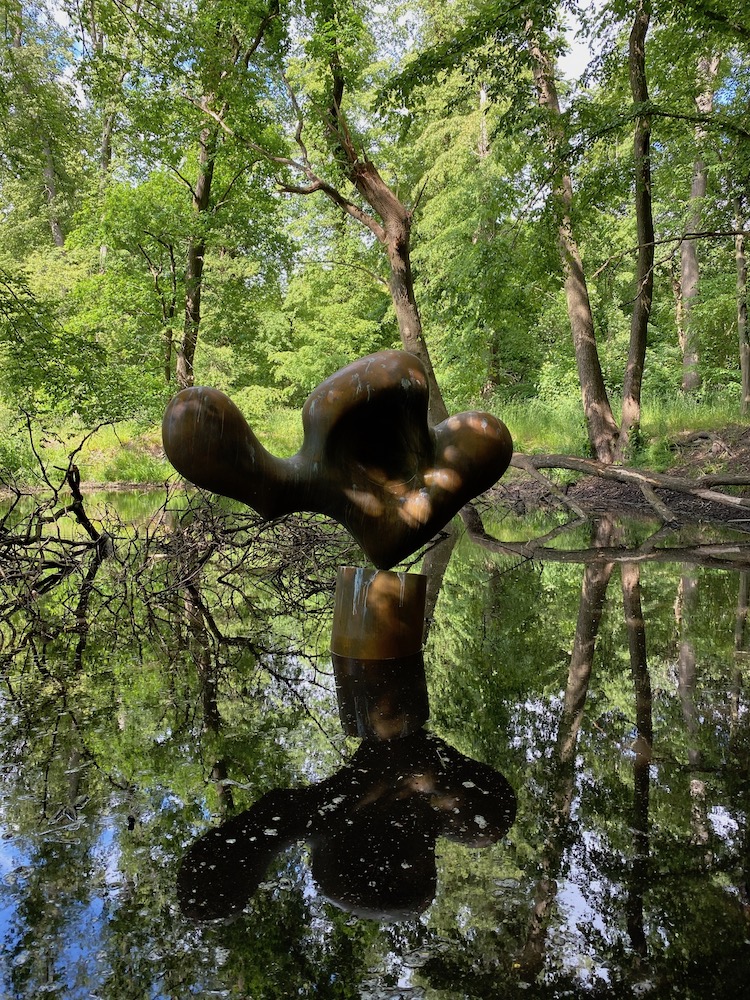 Es entbehrt also nicht eines gewissen Talents zur Selbstironie, dass sie abseits der Bronze des surrealistischen Bildhauers auch ein Werk von Maria Loboda in ihrem Park aufgestellt haben: Die 1979 in Krakau geborene Künstlerin hat mit ihrer „Sculpture in its Private Realm“ (2020) eine auf den ersten Blick fast identische Kopie von Hans Arps Bronze „Ruhendes Blatt“ geschaffen, die allerdings leicht schief steht und gut versteckt ist: Man findet sie inmitten eines Teichs, der von hohen Bäumen umgeben ist.