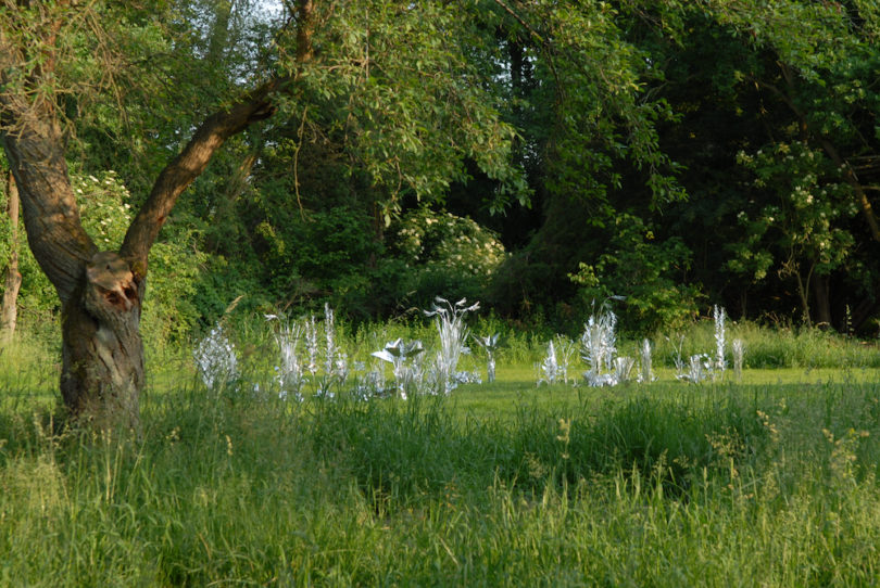 In einem Wäldchen hat der Berliner Künstler Carsten Nicolai mit seiner Stahlplattenkammer „Echo“ (2020) einen künstlichen Resonanzraum geschaffen, in dem der Besucher die Klopfklangeigenschaften seines eigenen Brustkorbs erkunden kann. Ja selbst der Engländer Tony Cragg, an dessen typischen Stapelskulpturen man sich auf unzähligen Kunstmessen längst satt gesehen hatte, wirkt in diesem Setting wieder neu und frisch: Seine silberne Säule „Elliptical Column“ (2012) wurde mitten auf einer Wiese zwischen grasenden Pferden platziert und sieht dadurch aus wie eine Fata Morgana.
