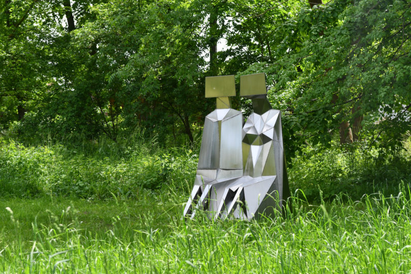 Gut 20 Kilometer nördlich der Berliner Stadtgrenze gibt es nun also einen Skulpturenpark. Das ist keine kleine Nachricht. Denn obwohl es die Kreativen der Hauptstadt seit einigen Jahren regelmäßig ins Umland zieht, hat der Speckgürtel im Kulturbereich immer noch große Löcher. Abseits der Kulturstadt Potsdam sind viele Kommunen klamm und auch private Mäzene rar. Als dauerhaftes Projekt in Brandenburg ist der Skulpturenpark Schwante daher recht allein auf weiter Flur – legt allerdings mit seinen namhaften Künstlern auch gleich die Messlatte ziemlich hoch an. In einer Ecke des Parks kann man in den Edelstahl-und-Glas-Pavillon „Play Pen for Play Pals“ (2018) des amerikanischen Künstlers Dan Graham treten, um durch die gekrümmten und teilweise spielenden Scheiben einen märchenhaft-verzerrten Blick auf die Welt zu werfen.