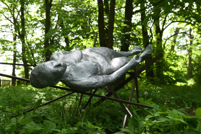 Blickt man an diesem verwunschenen Ort länger auf Lobodas Werk fallen Merkwürdigkeiten ins Auge: Die Künstlerin hat die Bronzeoberfläche der Skulptur mit künstlichen Flecken überzogen, die wie Kotspuren von Vögeln aussehen. Und so hat es den Anschein, als sei das Erbe der Moderne in einem Teich versenkt und der Natur überlassen worden. Darüber hinaus, so klärt der Ausstellungsführer auf, ist die auf alt getrimmte Skulptur auch eine Anspielung an die künstlichen Ruinen in den englischen Landschaftsgärten des 18. Jahrhunderts.