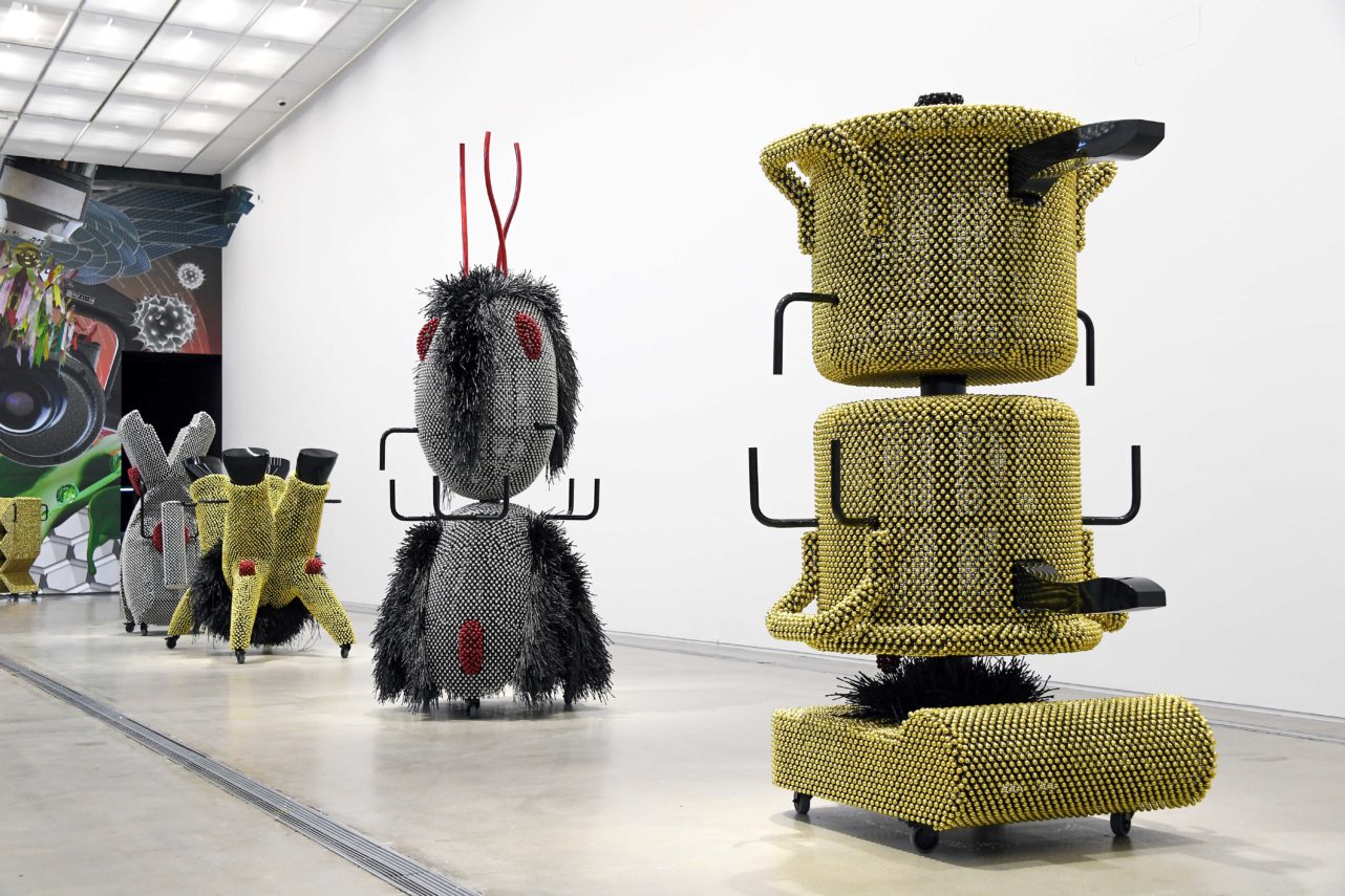 Hier greift sie die Lackkunst, eine traditionelle Handwerkstechnik Südostasiens, auf und gibt ihr durch die Öffnung zum Trivialen und Zufälligen einen neuen Sinn. Die Skulpturen der vierteiligen Gruppe „Sonic Domesticus“ repräsentieren gewöhnliche Alltagsgeräte wie einen Fön, ein Bügeleisen, einen Kochtopf oder eine Computermaus und wirken dabei ebenso technoid wie karnevalesk. Auf Rollen gestellt und mit Handgriffen an den Seiten ausgestattet, wecken sie Assoziationen zu theatralen Figuren in Bewegung, insbesondere zu Oskar Schlemmers Triadischem Ballett. Glöckchen übersäen ihre Oberflächen, was sie mit Ritualen diverser alter Kulturen, vom Fasching in Europa bis zum Schamanismus in Korea, verbindet.