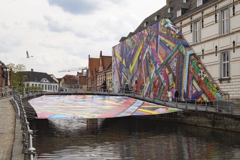 Wie ein Parcours durchziehen die temporären Installationen der internationalen Künstlerinnen und Künstler den historischen Stadtkern: Glänzende Masken mit farbigen Bändern der Belgierin Nadia Naveau verzieren den Kanal und heißen Passanten willkommen, an Häusern und Laternen der kleinen Gassen verstecken sich Vogelnester des argentinischen Bildhauers Villar Rojas. Dass dabei oft Gegenwart und Vergangenheit miteinander verwoben werden, zeigt kein Kunstwerk so deutlich wie Amanda Browders Textilinstallation „Happy Coincidences“. Nach einer Sammelaktion der US-amerikanischen Künstlerin entstand in Zusammenarbeit mit den Bewohnerinnen und Bewohnern der Stadt ein Flickenteppich in leuchtenden Farben. Installiert wurde die digitale Collage der zusammengenähten Stoffe in einer Straße aus dem 13. Jahrhundert, die nach den damals dort wohnenden und arbeitenden Tuchfärbern benannt ist.