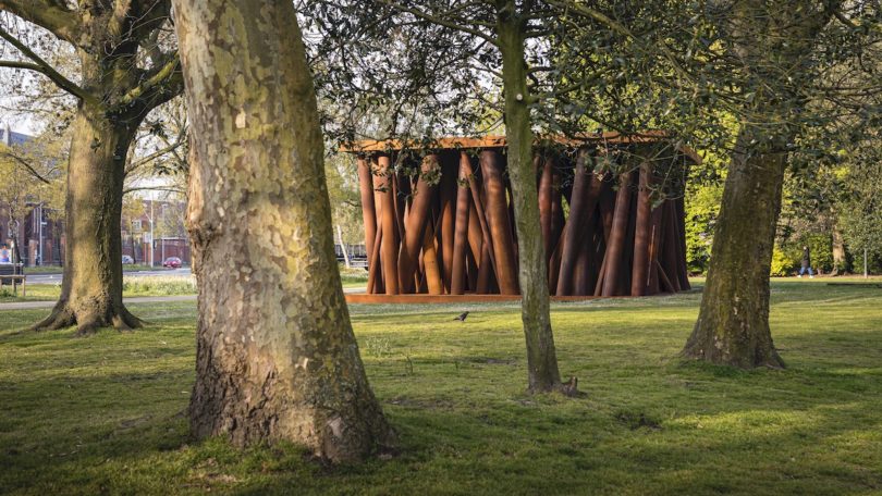 Nach vielen weiteren Interventionen ist die letzte Station der Route dazu gedacht, sich in einem Labyrinth aus 100 schrägen Säulen zu verlieren. In einem Park im Norden, etwas abseits des historischen Kerns gelegen, entfaltet der Pavillon des Kunst- und Architekturbüros Gijs Van Vaerenbergh seinen Charakter eines undurchdringlichen Baumgeflechts.