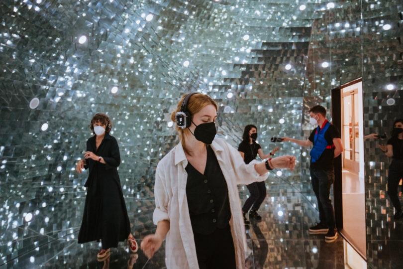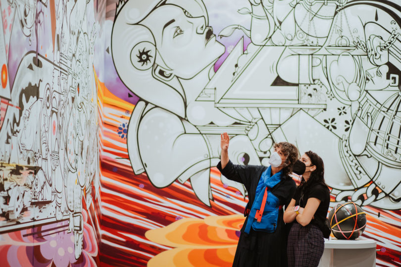 Die Besucher*innen können zum Beispiel ein 375 m² großes Wandgemälde im Street-Art-Stil bestaunen, am Rad der Geschichte drehen, Revolutionszüge an sich vorbeiziehen lassen, in einer riesigen Diskokugel zu den Klängen Berlins tanzen, die Original-Tür des Clubs Tresor sehen, Menschen und ihre Berlin-Geschichten über Sound-und Videoportraits kennenlernen – und dabei mehr ein Teil der Ausstellung sein als sie nur zu betrachten.