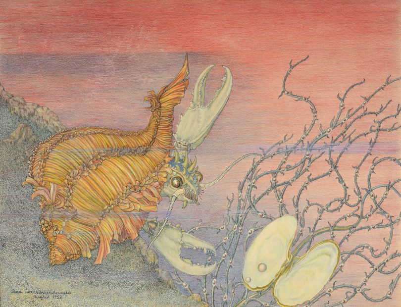 Schöner verschnörkelt hat man das Gehäuse eines Einsiedlerkrebses noch nie gesehen. Auch die Ranken der Wasserpflanzen sind herrlich verschlungen. Die Zeichnung „Einsiedlerkrebs“ von 1953 beweist, dass Ilna Ewers-Wunderwald der Ästhetik des Jugendstils bis zu ihrem Lebensende treu blieb. 1875 in Düsseldorf geboren, hatte sie als Zeichnerin und Buchillustratorin vor dem Ersten Weltkrieg großen Erfolg. Mit Kurzhaarschnitt und Zigarette widersetzte sie sich glorios den Erwartungen des Spießbürgertums. Dann geriet sie in den Zwanziger- und Dreißigerjahren leider in Vergessenheit. Doch seit einiger Zeit werden ihre fantasievollen Bilder aufs Neue entdeckt.