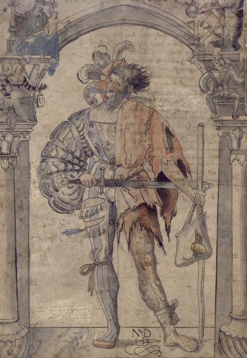 Drastisch schildert Nikolaus Manuel Deutsch auf seiner großen aquarellierten Federzeichnung die „Allegorie auf den Krieger, der zum Bettler wird“. Die Verelendung teilt den Söldner entzwei: Die rechte Körperhälfte ist elegant nach der neuesten Mode gekleidet, seine linke als zerlumpter Bettler mit wildem Bart, strähnigem Haar, Syphiliswunden an den Beinen und Bettelstab dargestellt. Den schnellen sozialen Abstieg im Söldnerwesen kannte Deutsch, der sich wiederholt als Schweizer „Reisläufer“ verdingte, aus nächster Nähe. Nach dem Augsburger Armenunterstützungswesen, das 1522 von kirchlichen Einrichtungen auf die Stadt übergegangen ist, mussten „Würdige Bedürftige“ schuldlos in Armut geratenen sein. Almosenempfänger mussten Erkennungszeichen tragen und hatten Wirtshausverbot. Nicht almosenfähig waren rüstige Bettler, Faule oder Verschwender …