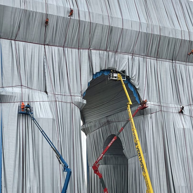 Die Verpackung des 50 Meter hohen Triumphbogens ist Christos höchstes Projekt, da das Denkmal um 14 Meter höher ist als die Türme des Berliner Reichstags, dessen Verpackung 1995 stattfand. Übrigens damals wie heute mit den gleichen deutschen Firmen: eine konzipierte und installierte die Metallstruktur zum Schutz des Gebäudes, eine andere webte den speziell hergestellten Stoff (der außen silbrig-grau ist und innen blau), eine dritte nähte die enormen Stoffbahnen zusammen, eine vierte fabrizierte die circa drei Zentimeter Durchmesser dicken roten Seile. Insgesamt arbeiten 1200 Menschen am Projekt, dessen Timing perfekt ist: die Gratis- Schaustellung beginnt zu den „Europäischen Tagen des Denkmals“ an diesem Wochenende und dauert bis zur sogenannten „Schlaflosen Nacht“ (Nuit blanche). Wo Kulturereignisse über die ganze Stadt verteilt organisiert werden.