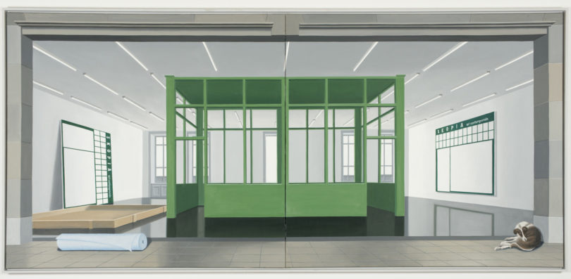 Der Künstler Thomas Huber malt Bilder und spricht in der Ausstellung vor ihnen. Er lädt das Publikum ein, ihm zu folgen und sprechend führt er die Betrachter in das Bild hinein. Er setzt sein Publikum ins Bild. 2014 malte er das „Ladenschild“. Es zeigt seine Galerie in Genf, in der Schweiz und bezieht sich auf das „Ladenschild des Kunsthändlers Gersaint“ von Antoine Watteau. In der Ausstellung, in der beide Gemälde zu sehen sind, wird er im Dialog über die Besonderheiten seines Bildes und den Bezug zu Watteaus Ladenschild sprechen. Thomas Huber und seine Gesprächspartner laden das Publikum dazu ein, ihnen in den Bildraum des „Ladenschilds“ zu folgen.