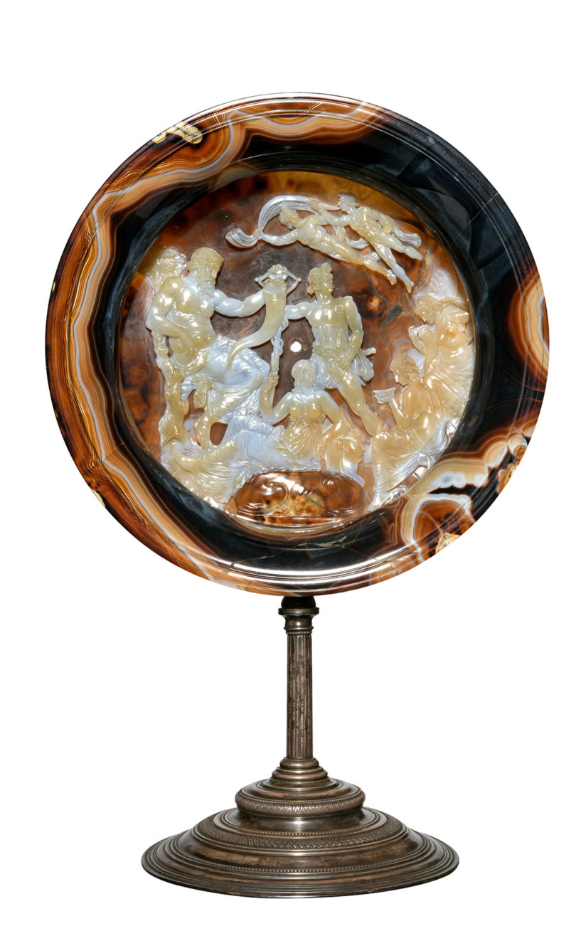 Von der berühmten Gemmensammlung Lorenzo de’ Medicis, die 1586 in den Besitz der Farnese gelangte, strahlt – als eine der kostbaren Leihgaben aus Neapel – die „Tazza Farnese“ aus Sardonyx ihre Faszination aus. Mit 20 Zentimeter Durchmesser ist sie die weltgrößte Kamee und ein künstlerisches Meisterwerk des Hellenismus, das seine wechselnden Besitzer, darunter eben auch die Farnese, unzerstört überlebte. Gezeigt wird sie unweit von Tizians berühmter „Danaë“ in der Biblioteca Palatina mit ihren deckenhohen Bücherschränken, die nicht nur Kulisse sind, sondern zugleich das Ausstellungsthema versinnbildlichen.