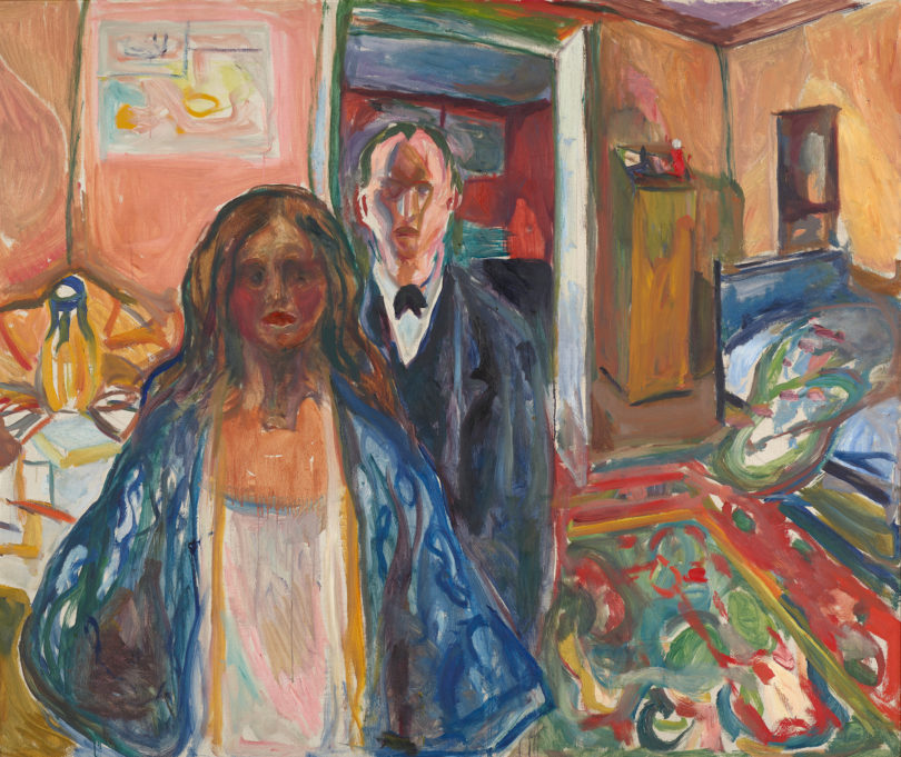 Ohnehin wird es schnell klassisch, sobald man Foyer und Treppenhaus hinter sich lässt: In den Sälen der Dauerpräsentation regiert das fein abgestimmte Kunstlicht, die Bilder werden auf farbigen Wänden präsentiert. Da Munch häufig mehrere Varianten seiner Lieblingsmotive malte und einiges behielt, ist in dieser weltweit größten Sammlung seines Œuvres so gut wie jedes bekannte Werk vertreten. Die Bilder sind dabei nicht chronologisch, sondern nach Themen geordnet, und bereits im Anfangsraum zum Sujet „Liebe“ löst man das Ticket zu Munchs großer Gefühlsachterbahn. Im allerersten Rahmen ist ein Doppelporträt des Künstlers mit seiner Partnerin Tulla Larsen zu sehen. Drei Jahre waren die beiden in einer turbulenten Beziehung verfangen, die 1902 mit einem mysteriösen Pistolenschuss und einer verletzten Malerhand abrupt endete. Bezeichnenderweise sind in dem Gemälde von 1905 die beiden Hälften durch einen Schnitt in der Leinwand getrennt und individuell betitelt.