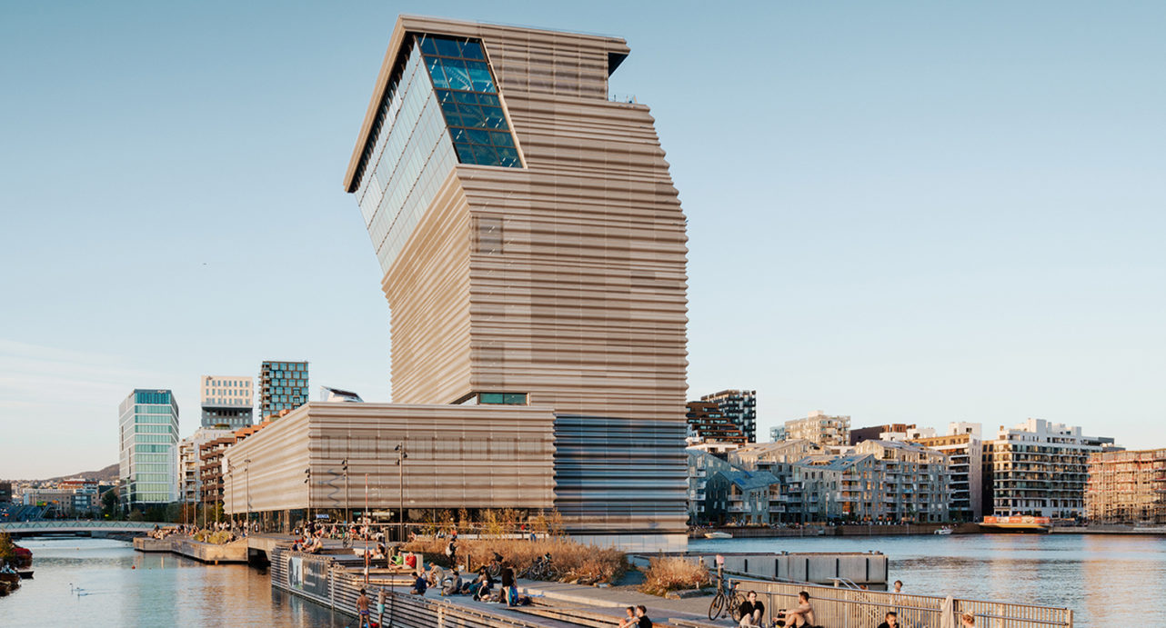 Dem Hochhaus des spanischen Büros Estudio Herreros fliegen die Herzen nicht automatisch zu. Von der Front aus betrachtet neigt der mit einer grauen Aluminiumfassade verkleidete 57-Meter-Turm seine Spitze der Stadt entgegen. Leicht schlumpfig, so wirkt es. Auch keimt die Vermutung auf, die kühle Kongresszentrumsästhetik könne nicht recht zu einem von hohen Gefühlstemperaturen durchströmten Maler wie Munch passen. Aber dann passt sie in den Details – siehe Rolltreppen-Offenbarung – eben doch.