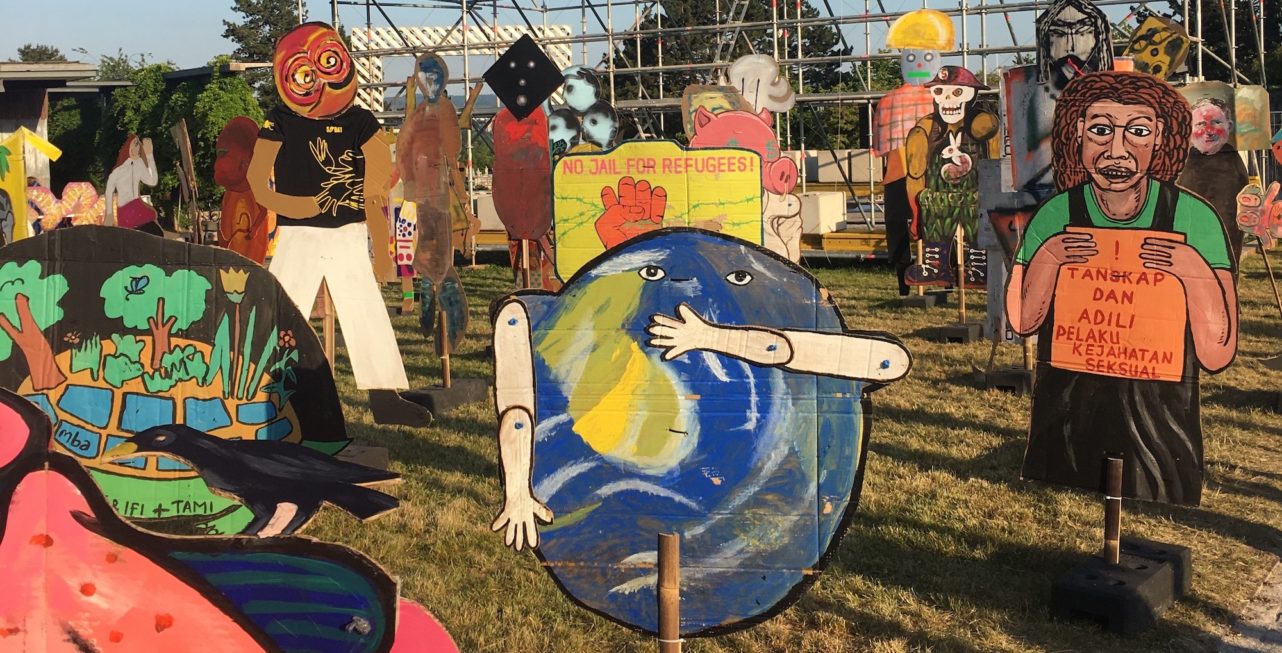 Sehr schnell lässt man sich von der menschenfreundlichen Atmosphäre des Lumbung einnehmen – der kollektiv betriebenen indonesischen Reisscheune als Metapher für Ruangrupas Methode. Schon die Pressekonferenz, in Kassel bislang immer ein quälend langes Diskursgewitter, war diesmal ein lustiges, kurzweiliges Spektakel. Es fand im Kasseler Fussballstadion statt, war von Musikvideos und einer lustigen Spielzeug-TV-Performance des indonesischen Künstlers Agus Nur Amal Pmtoh aufgelockert und nahm einen schon ein durch die allseits herrschende gute Laune der vielen „Lumbung Members“ und „Lumbung Artists“, die Ruangrupa (mit zehn „Kernmitgliedern“ vor Ort) immer wieder bejubelten.