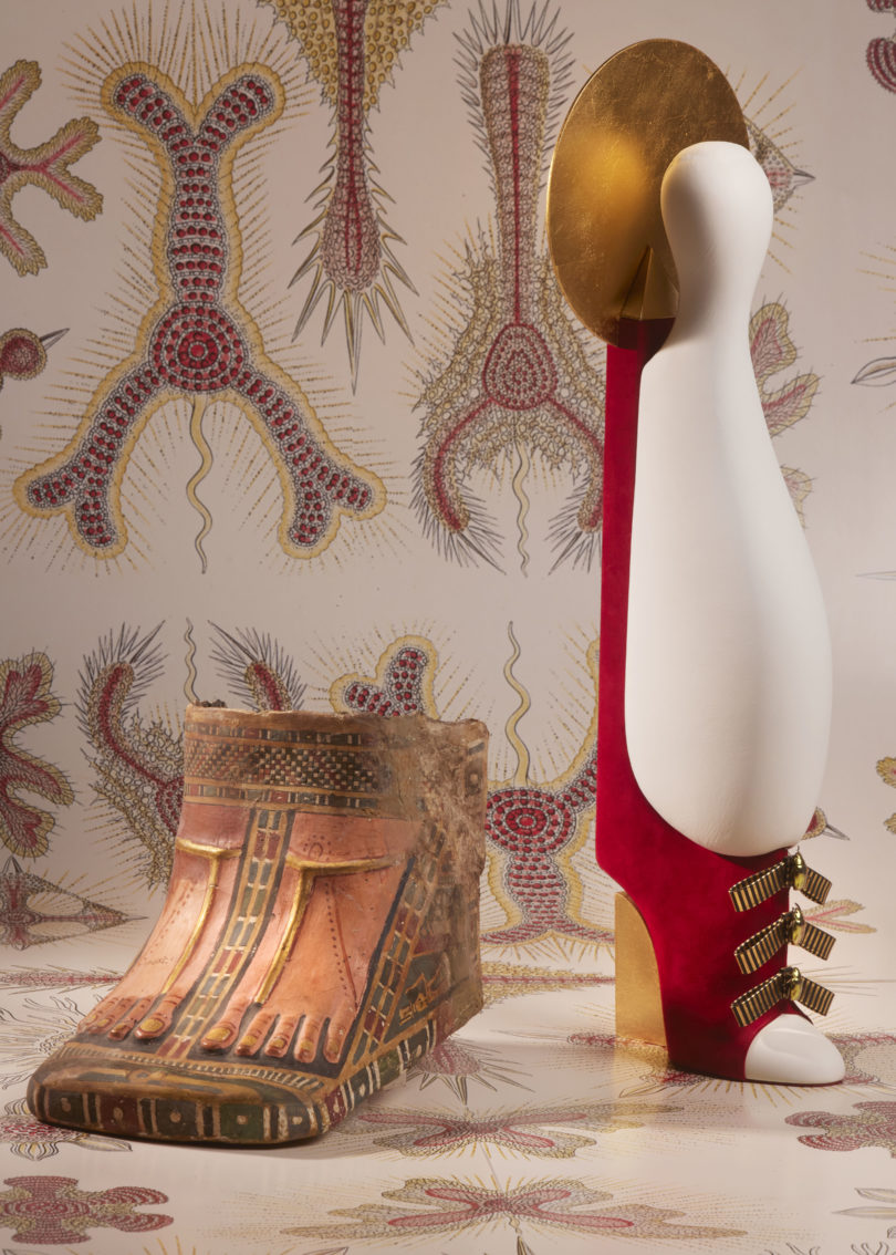 In einer geschickten und ideenreichen Präsentation folgt die Ausstellung den Spuren seiner Sohlenkunstwerke, die er nun schon seit dreißig Jahren produziert. Zeitgenössische Kunst, Artefakte diverser geografischer und kultureller Herkunft treten in Dialog mit den flamboyanten Kreationen der Marke Louboutin. Eine Art moderne Wunderkammer voller Leihgaben aus Museen und Privatsammlungen für die Lust am Sehen und Entdecken. Der Schuhmagier ließ sich dafür auch von Stücken aus seiner umfangreichen Privatkollektion inspirieren, die den Bogen spannt von archäologischen Funden über portugiesische Azulejos und Buntglasfenster bis zu zeitgenössischer afrikanischer Kunst.