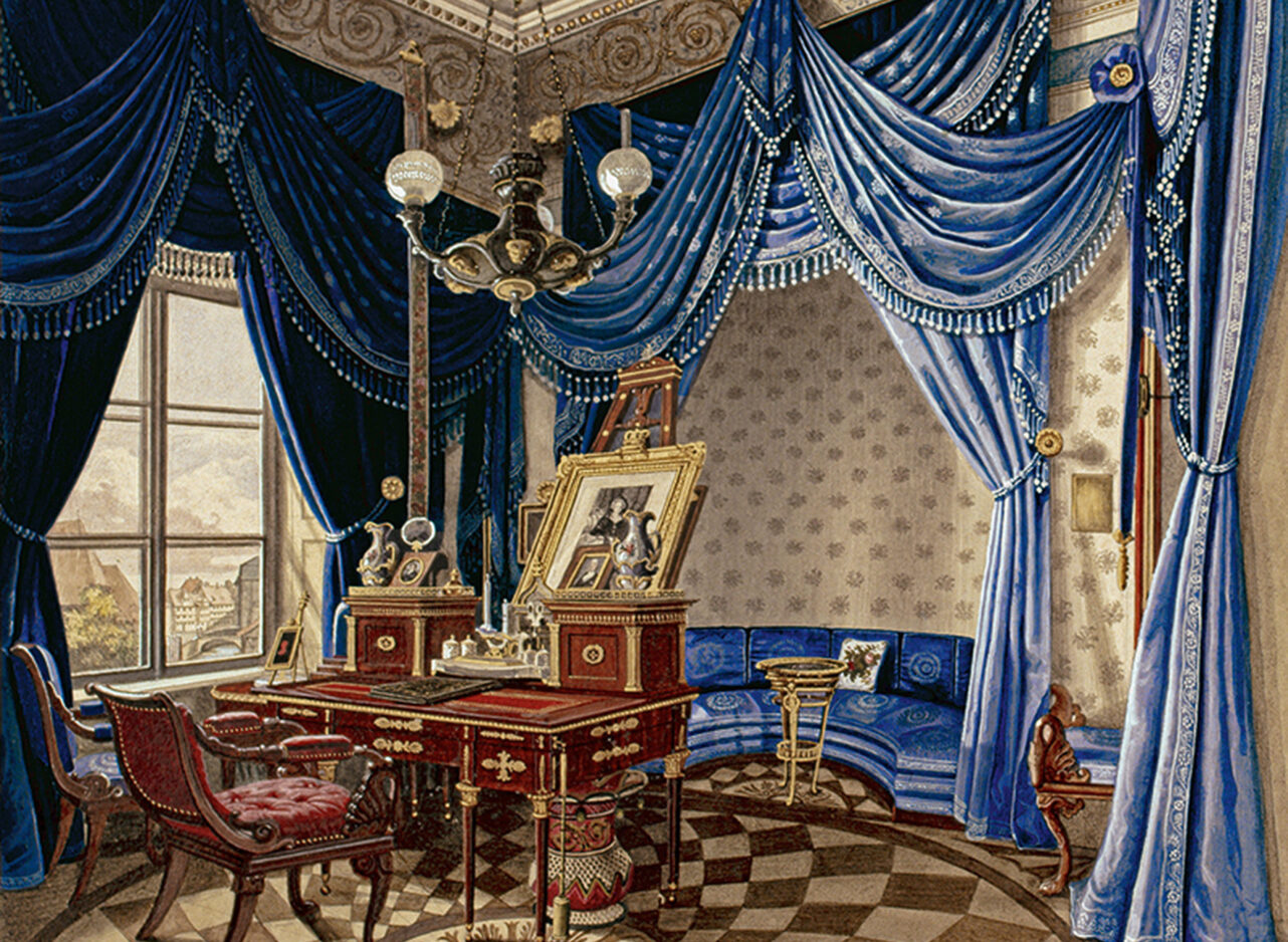 Zwei hohe Bücherschränke aus dem Wangenheim-Ensemble demonstrieren in der Ausstellung Laves’ Stil: schlicht, puristisch, wie ein antikisches Monument. Als einziger Schmuck leuchtet unter dem leicht hervorkragenden Gesims ein goldfarbener Ornamentfries. Edel und zugleich dezent gestaltete Laves das halbrunde Arbeitszimmer des Staatsdieners, wovon leider nur noch ein Aquarell von 1843 zeugt. Schwungvoll mit ausschweifenden Säbelbeinen steht ein Mahagonisessel mit stilisierten Schwanen-Armstützen vor einem streng gegliederten Schreibtisch mit spitz zulaufenden Beinen sowie Blatt- und Rosettenbeschlägen – die Wände mit chamoisfarbener Seide bespannt, die Draperien dunkelblau und in der runden Nische ein blauer Diwan mit einem Bronzetischchen in Form einer antiken Feuerschale. Die höfischen Repräsentationsnormen des Spätempire musste Laves hier nicht befolgen, es ging um die Noblesse des Einfachen.