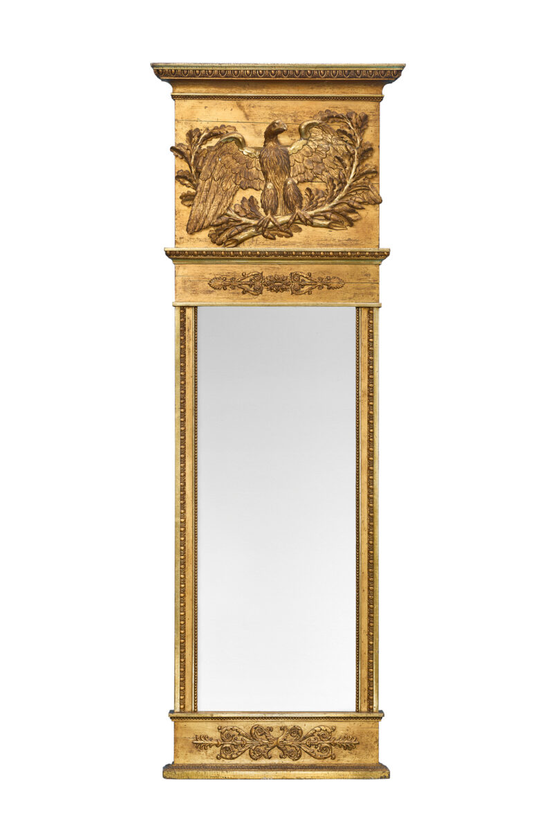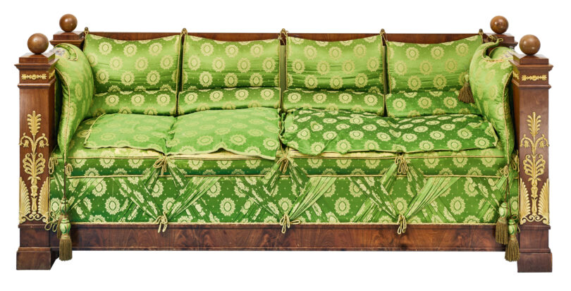 Das Einfache bevorzugte der Architekt auch in seinem eigenen Haus. Ein biedermeierlicher Esszimmerstuhl mit einem Sprossen-X in der Rückenlehne, ein halbhoher Bücherschrank mit dem gleichen Motiv in den Feldern der Glastür, ein einfacher vergoldeter Rahmenspiegel mit applizierten Ornamenten im Sockel und im Architrav sprechen dafür, dass Laves nicht das Extravagante brauchte, um als Entwerfer zu überzeugen. Mit kleinen Attributen konnte er den Charakter eines Stücks von einfach auf repräsentativ trimmen. Bestes Beispiel dafür ist die Präsentation von zwei identischen Kastensofas. Für seinen eigenen Salon hat er die pfeilerartigen Frontstützen dezent mit geschnitztem, dunkel gebeiztem Palmettendekor appliziert. Für einen Auftraggeber hat er dem Modell mit vergoldeten Bronzebeschlägen etwas mehr Pomp verpasst.