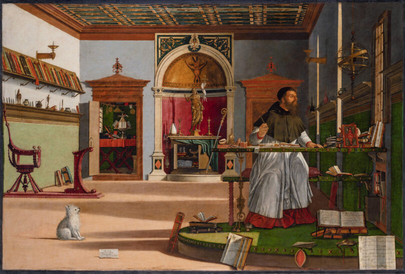 Ein Höhepunkt unter den neun Bildern ist die enigmatische „Vision des heiligen Augustinus“, deren Bedeutung 1959 erstmals entschlüsselt wurde: In einem mit detaillierter Feinmalerei wiedergegebenen humanistischen Studiolo hält der Kirchenvater beim Schreiben eines Briefes an Hieronymus inne, als ein mystischer Lichtstrahl durch das Fenster ihm den soeben eingetretenen Tod des Gelehrten ankündigt. Vor fünfzig Jahren, bei der ersten umfangreichen Carpaccio-Ausstellung im Dogenpalast, erschien der gesamte Zyklus in einem kühl-modern gestalteten Ambiente; diesmal belässt man die Werke in der kleinen Scuola Dalmata, wo sie im Halbdunkel von Gebetsbänken aus betrachtet werden können.