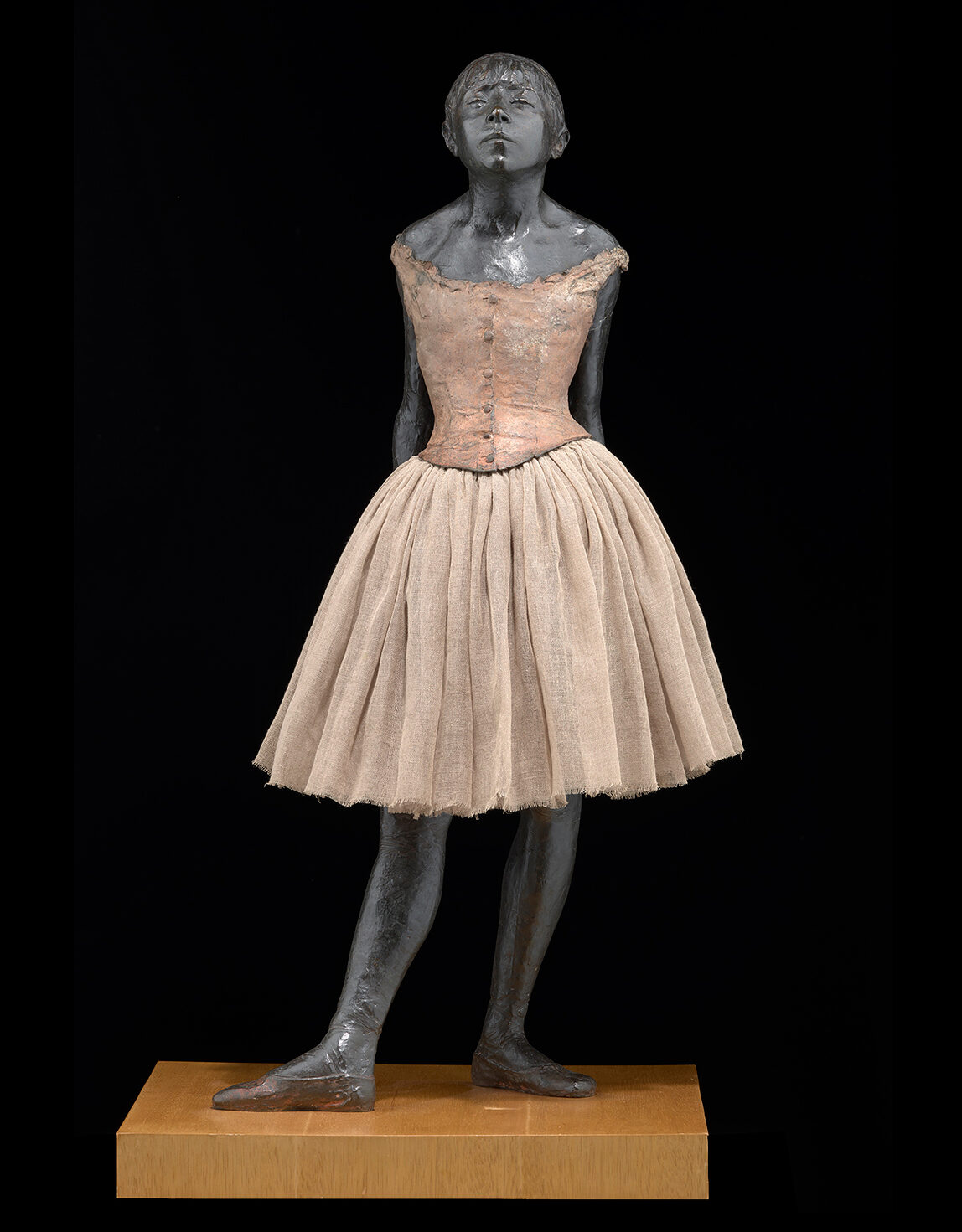 ShareDie Skulptur der jungen Tänzerin ist eines der bekanntesten plastischen Werke von Edgar Degas (1834-1917). Der französische Maler stellte das Kunstwerk im Jahr 1881 während der sechsten Pariser „Ausstellung der Impressionisten“ aus. Er hatte die Arbeit mit realen Attributen wie dem Tutu, einem echtem Haarzopf und Ballettschuhen versehen, was das Publikum zutiefst schockierte. Degas sollte zu seinen Lebzeiten nie wieder eine Skulptur ausstellen. Heute gibt es weltweit 30 Figuren der „Kleinen vierzehnjährige Tänzerin“, die posthum gegossen wurden. Eine davon wurde 1926 von der Galerie Flechtheim für die Dresdner Kunstsammlungen erworben. Nach Jahrzehnten in der Dauerausstellung des Albertinums war es an der Zeit für eine umfassende Restaurierung, denn die Oberfläche der Tänzerin war matt geworden und wies einige Korrosionsspuren auf.