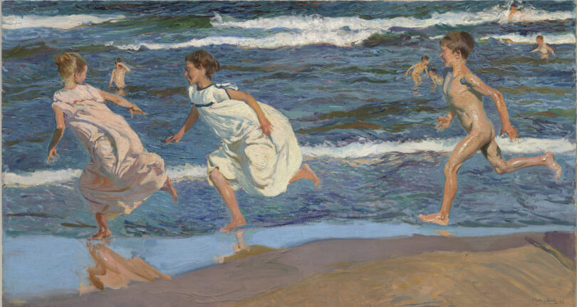 Der Strand als Urlaubs- und Erholungsort, das wird erst im Verlauf des 19. Jahrhunderts zu einer großen Sache. Plötzlich fahren die Bürger nach Scheveningen, Trouville und Le Havre, nach Skagen. Und bei dem spanischen Impressionisten Joaquín Sorolla, für den im 100. Todesjahr 2023 viele gute Ausstellungen stattfinden, etwa im Museo Sorolla in Madrid, aber vor allem auch in seiner Geburtsstadt Valencia, flanieren stolze Spanier in blendend weißen Kleidern nur wenige Zentimeter vom Schäumen des Mittelmeers entfernt, als sei der Strand eine Einkaufsstraße. Doch er ist eben genau das Gegenteil: kein enges Ladengeschäft begrenzt, keine buckelnden Verkäufer stehen im Weg, und der strenge Überwachungsblick der Verwandtschaft, vom strahlenden Sonnenschein geblendet, kommt mit dem Maßregeln einmal nicht hinterher. Die jungen Menschen können in Ruhe toben, tuscheln, lachen. Und abends träumen selbst die strengsten Tanten in das Farbenspektakel des Sonnenuntergangs – in diesem Moment sind die nordischen und südlichen Farben übrigens ähnlich bunt, hier kann ein niederländischer Anton Mauve mit seinem Gemälde „In Scheveningen“ mit Sorollas stets rötlich-gelbem Licht mithalten (oder auch Hendrik Willem Mesdags goldener „Sonnenuntergang mit Krabbenfischern“).