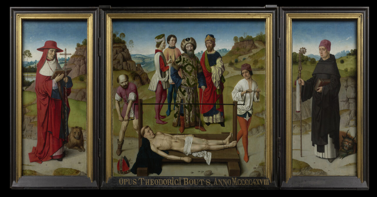 In dramatischen, teils grausamen, vielfigurigen Martyrien-Darstellungen agieren oder erleiden Bouts’ typische, schmale, gelängte Figuren mit ausgreifenden Gesten und verzerrten oder leidenden Gesichtern körperliche Schmach und seelisches Leiden in einer weiter Landschaft. Man beachte, welche Bedeutung Bouts den Händen einräumt: schmerzverkrampft durchbohrt und Blutverspritzt, wenn sie ans Kreuz genagelt wurden, kräftig zupackend, wenn sie einen Stab umgreifen, zart, wenn Maria das Jesuskind hält. Beim direkten Werkvergleich des großen Vorbilds Rogier van der Weyden und Dieric Bouts wird ersichtlich, dass Bouts` Zeichenstil weniger ausgearbeitet ist, Gesichter ein wenig plumper erscheinen, das „Chiaroscuro“ des Nachgeborenen wiederum den Eindruck echter Beleuchtung auf Gesicht- und Haut, und damit eine neue Lebendigkeit, erwirkt. Zu Bouts’ Hauptwerken gehört die sogenannte „Perle von Brabant“, ein Flügelaltar mit der „Anbetung der Heiligen Drei Könige“ aus der Alten Pinakothek in München – nun ein Highlight in der Ausstellung.