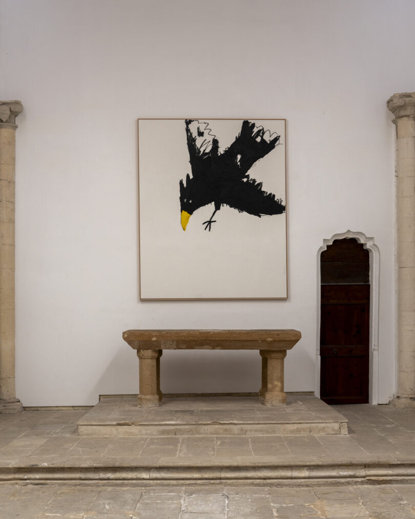Ebenfalls nicht versäumen darf man die Dependance der Berliner Galerie Kewenig. Sie ist seit bald vierzig Jahren international aktiv und renommiert. Die Gründerin Jule Kewenig zog sich 2004 nach Palma zurück und konnte bald darauf in einer gotischen Kapelle einen wunderbaren, charaktervollen Ausstellungsraum beziehen. Jetzt zeigt sie dort Gemälde des Berliner Künstlers Andi Fischer, der in einem sehr souveränen, expressiven, oft ungestüm, manchmal auch auf sehr eindringliche Weise kindlich wirkenden Stil mit der Kunstgeschichte kommunziert, vorzugsweise mit Dürer oder noch älterer mittelalterlicher Malerei. Bei Kewenig lässt er auf großen weißen Flächen Raben und Bergdohlen im Sturzflug herabsinken. Fischer spielt mit dem alten Klischee vom Unglücksraben, eine Anspielung auf die Krisen- und Endzeitstimmung, die uns alle angesichts der schrecklichen Krieg und der drohenden Klimakatastrophe heimsucht (bis 9. Dezember).