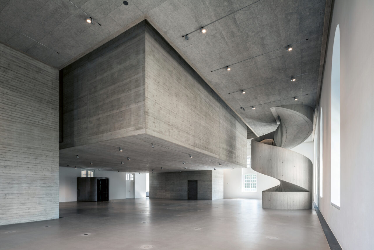 Die Sieger des 2017 ausgelobten Architekturwettbewerbs, Nieto Sobejano Arquitectos aus Madrid, haben das Gebäude in den vergangenen sechs Jahren radikal umgebaut: Allein die historischen Außenwände blieben stehen, das Innere wurde dagegen komplett entkernt. Um gegen künftige Hochwasser besser gewappnet zu sein, ist nun eine Auffangwanne unter das Gebäude gelegt, und die Haustechnik residiert im Dachstuhl. Der visuelle Clou ist der eingebaute Betonkubus, der auf drei Ebenen das Depot des ADA enthält: Seitliche Lichtschächte, die bis zur Spitze des Gebäudes reichen, suggerieren den Besuchenden im Erdgeschoss das Gefühl, dass der Würfel frei über ihren Köpfen schwebt. Tatsächlich verteilt sich sein Gewicht jedoch über zwei anliegende Treppenhäuser und über ein Strebewerk aus Stahl, das hinter einer Verschalung verborgen und in den Ecken verankert ist. An der Südwand der Ausstellungshalle führt zudem eine Betonwendeltreppe – kein notwendiges, aber formal doch pittoreskes Element – ins obere Geschoss mit den Leseräumen.