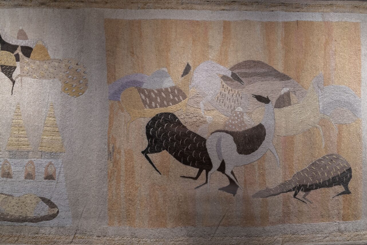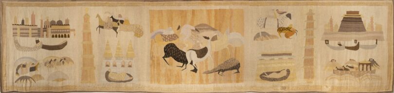 „Die Reiserinnerungen sind eine unerschöpfliche Quelle. Sie erzählen von einem Venezianer, der in zwei Welten zu Hause war: im Orient und im Okzident“, sagt die Kuratorin Chiara Squarcina. Wie gegenwärtig Marco Polo in der modernen Reisekultur ist, zeigt unter anderem eine acht Meter breite bestickte Leinwand des slowenisch-italienischen Malers und Grafikers Zoran Mušič aus dem Jahr 1951. Seine piktorale Narration der Asienreise zierte einst den Salon eines Transatlantikliners und wurde 2016 anlässlich einer Ausstellung in Monfalcone, der nördlichsten Hafenstadt am Mittelmeer, aufwendig restauriert. Im Dogenpalast nimmt die Wandarbeit einen ganzen Raum ein und die Besucherinnen und Besucher können sich dem Kunstwerk ungehindert nähern, um die Präzision der Ton-in-Ton-Stickereien näher zu betrachten.