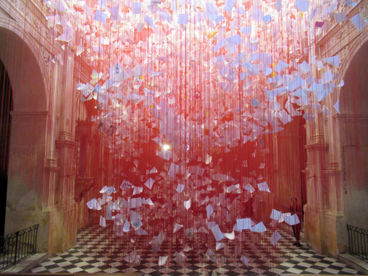 750 Kilometer lange Wolle, dazwischen Dankesbriefe in Anspielung an Votivbilder in Kirchen als Zeugnis für erhörte Gebete. Das filigrane Kunstwerk von Chiharu Shiota hängt in der Kapelle Mariä Heimsuchung in Aix-en-Provence. Die raumfüllende Installation „Collecting Feelings“ (Gefühle sammeln) hat die in Berlin lebende japanische Künstlerin für die Kunstbiennale in der südfranzösischen Stadt geschaffen.