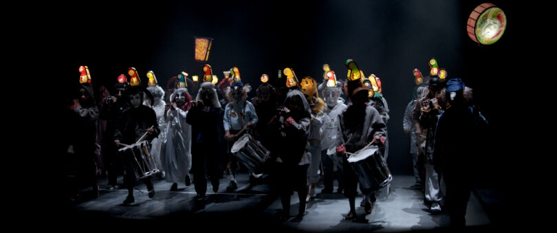 Die Kraft des Kollektivs brodelt auch in Cogitores zweitem Video, das Teil seiner Ausstellung „Bodys in Sync“ im Bauhaus Museum in Dessau ist. Im Gegensatz zu „Les Indes Galantes“ ist das Bild in „Morgenstraich“ statisch. Clément Cogitore wurde 1983 im Elsass geboren, die Rituale der Basler Fastnacht, die größte Fastnacht in der Schweiz, sind fest in seinen Kindheitserinnerungen verankert. Der Umzug, der am Montag nach Aschermittwoch um 4 Uhr morgens beginnt, läutet die Karnevalszeit mit schrillen Pfeifen und Trommelschlägen ein. Alle Lichter der Stadt sind erloschen, wenn die sogenannten Cliquen in bunten Kostümen und Masken durch die Straßen marschieren.