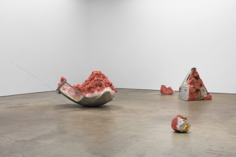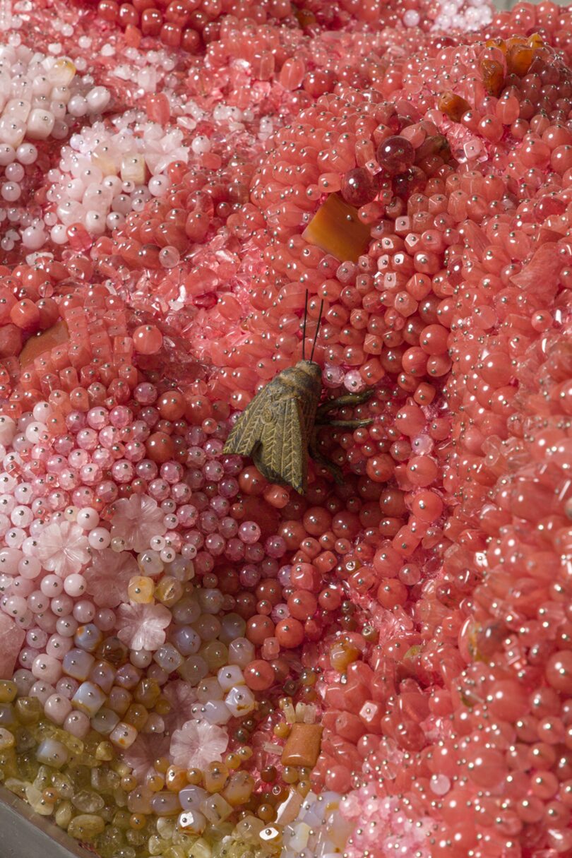 Ich bin zuerst auf das Material gekommen – ich war daran interessiert, mit Edelsteinperlen zu arbeiten, und sah die Fäulnis als Gegenstück zu den Steinen, als eine Möglichkeit, etwas kulturell und materiell Wertvolles für etwas zu verwenden, das als abstoßend oder abscheulich gilt. Die Ideen von Edelsteinen und Schimmel sind zwar gegensätzlich, aber sie ähneln sich. Deshalb funktioniert es. Themen wie Geburt, Verfall, Tod oder Zeit tauchen in meiner Arbeit immer wieder auf, aber bei den „Bad Fruit“-Skulpturen geht es mehr um materielle und assoziative Gegensätze und Spannungen.