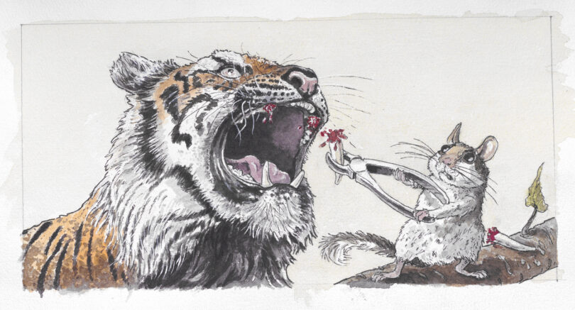 Die Ausstellung legt besonderen Fokus auf die technisch brillanten Tierszenen, die seit 2008 in der F.A.Z. veröffentlicht werden und seither für große Aufmerksamkeit sorgen. In der Tradition des jahrtausendealten Erzählmediums der Fabel werden juristische Fragestellungen des Staatsrechts ins Bild gesetzt und dabei – ausnahmslos durch Tiere – pointiert beantwortet. Diese Karikaturen interpretieren das Sujet der Tierfabel völlig neu.