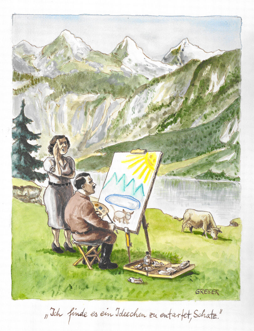 Zusätzlich präsentiert die Ausstellung eine Vielzahl von Zeichnungen mit Lokal- und Regionalbezug, darunter Bierdeckel für eine bekannte Aschaffenburger Biermarke, aber auch viel diskutierte Arbeiten wie das Gresersche Soloprojekt „Der Führer privat“.