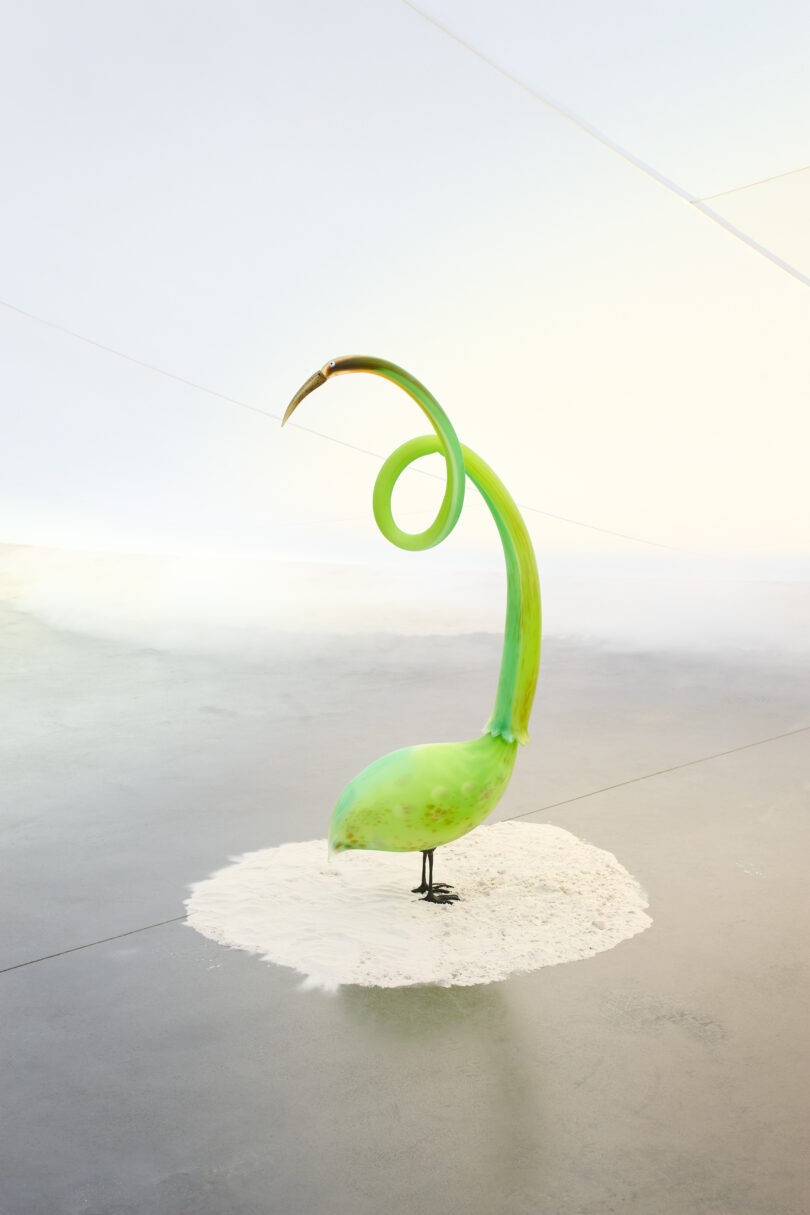 Komplexe Gegenwartsthemen verflechten sich in dieser Ausstellung mit dem Untertitel „In the Mist of It All, above Front Tears“, die das Museum De Pont im südniederländischen Tilburg zeigt. Und doch ist alles, wie stets bei Prouvost, ein kurzweiliger Entdeckungsparcours. Viele Vögel – Symbole für Migration – tauchen auf: als Figuren eines Schattenspiels, gestickt in Wandteppiche oder als Skulpturen aus Muranoglas. Neben einem gläsernen Federtier leuchten auf einem größeren Felsbrocken drei kleine reale Himbeeren im üppigsten Rot. Kunsttiere, Naturobjekte, Publikum – alle sind unter den großmütterlichen Fittichen beschirmt und verbunden. „Es geht auch um Gemeinschaft mit anderen Denkweisen: Können wir der jeweils andere werden? Können wir Vögel werden?“, erklärt Prouvost.