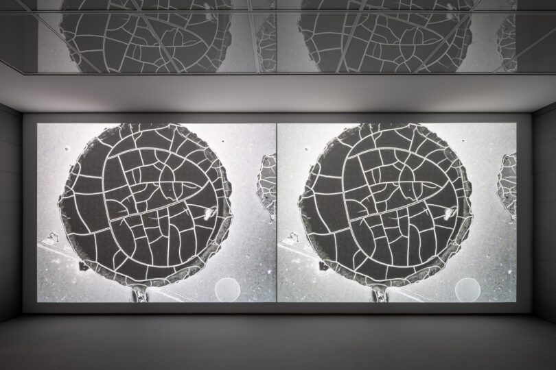Wie menschliche und nicht-menschliche Organismen koexistieren und Lebensräume ohne menschliches Eingreifen organisiert werden können, zeigt die orts- und zeitbezogene Installation „The Reek“ (2024) von Dan Lie. Je nachdem, wie sich die Bakterien, Pilze oder Pflanzen als Akteure des Werks verhalten, verändert sich der Ausstellungsraum entsprechend und macht dadurch den Verfall von ökologischen Prozessen nicht nur sichtbar, sondern auch durch den variierenden Geruch sinnlich erfahrbar.