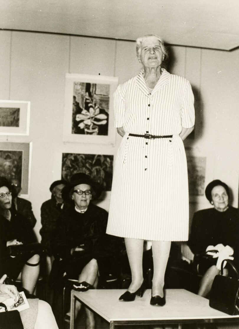 Spürbar wird in Chemnitz auch ihre ungeheure Energie. 1955 – da war Hanna Bekker vom Rath jenseits der sechzig – ging sie auf große Tour. Mit einem von ihr bemalten Metallkoffer voll Kunst reiste sie durch Nord- und Südamerika, nach Südafrika, Indien, Brasilien, um für den Expressionismus ebenso wie für Ernst Wilhelm Nay und Paul Klee zu werben. Die Frau, die an ihrem 70. Geburtstag, das bezeugt ein wunderbares Foto in der Ausstellung, im Kunstkabinett auf einen Tisch steigt, um von der ganzen Festgesellschaft gehört zu werden, stemmt ihren Beruf mit mitreißender Leidenschaft.