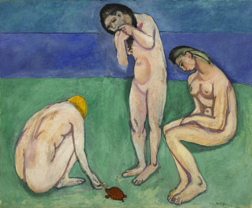 Dass sich Matisse auf seinen Errungenschaften keinesfalls ausruhte, wird im nächsten Saal das großformatige Hauptwerk „Badende mit Schildkröte“ von 1907/1908 beweisen. In diesem Bild ist die Komposition radikal vereinfacht und auf die monumental angelegten weiblichen Figuren zentriert, die sich um eine etwas rätselhaft vorbeikrabbelnde Schildkröte gruppieren. Beim Hintergrund mit den zwei getrennten Farbzonen in Grün und Blau ließ sich Matisse von Giottos Fresken in Padua inspirieren. Das Gefühl, das von diesen Meisterwerken des Spätmittelalters ausgehe, „steckt in den Linien, in der Komposition, in der Farbe“, schrieb er 1908 in seinen „Notizen eines Malers“. Und er zog für sich den Schluss: „Die Komposition ist die Kunst, in dekorativer Weise die verschiedenen Elemente anzuordnen, über die der Maler verfügt, um seine Gefühle auszudrücken.“