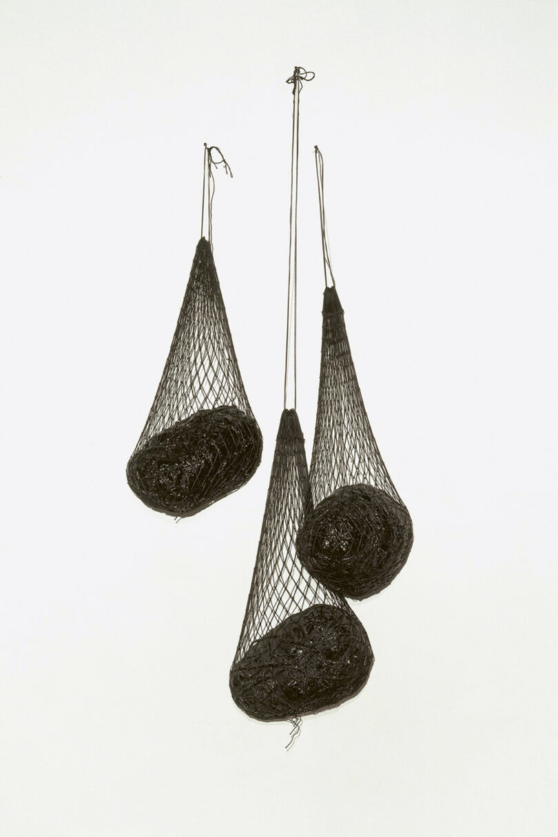 Alles klar, ungegenständliche Kunst darf auch mal sexy sein. Dass die Courtauld Gallery zu diesem klischeehaften Titel nur Kunst von Frauen versammelt, ist dann allerdings peinlich. Vergessen wir den doofen Titel und freuen wir uns am Aufeinandertreffen dreier skulptural arbeitender Gigantinnen: Bei Louise Bourgeois’ üppigen Busen- und Phalliformen ist Eros noch nachweislich im Spiel. Aber in Eva Hesses Werken wie „Untitled (Three Nets)“ von 1966(u.) baumelnde Hoden erkennen zu wollen, würde ihre feinsinnigen Beiträge zur Minimal Art fehlinterpretieren. Gleiches gilt für Alice Adams, die mit abstrakten Stoffgebilden in deutliche intellektuelle Opposition zum harten Metallminimalismus der Machomänner ging.