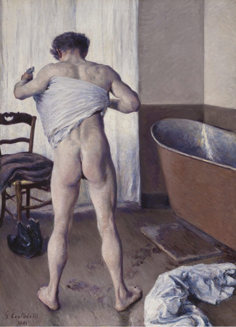 Die Ausstellung „Caillebotte. Peindre les hommes“ („Männer malen“) geht jetzt gegenüber klassischeren Präsentationen weniger dem Phänomen der Aufhellung und Erweiterung seiner Palette nach, die auf den dunkeltonigen Naturalismus der „Parketthobler“ und anderer Interieurs folgte, auch nicht dem sich lockernden Pinselstrich, den er von Monet und Sisley übernahm, oder der geradezu spleenigen Betonung von Perspektiven und Diagonalen. Im Mittelpunkt stehen vielmehr Themen und Motive, die den Zeitgenossen als innovativ, ja dem Leben abgeschaut galten, und hier vor allem solche mit Männern, einschließlich Porträts oft lediger Freunde und Bekannter. Frauen spielen dabei durchaus eine Rolle, nicht nur die Mutter des Malers, sondern auch eine geheimnisumwobene Gefährtin, die er nie heiratete. Keinesfalls üblich war es dagegen, aus der Wanne gestiegene Männer im Adamskostüm zu malen, als müssten Gegenstücke zu Degas’ weiblichen Badenden her.