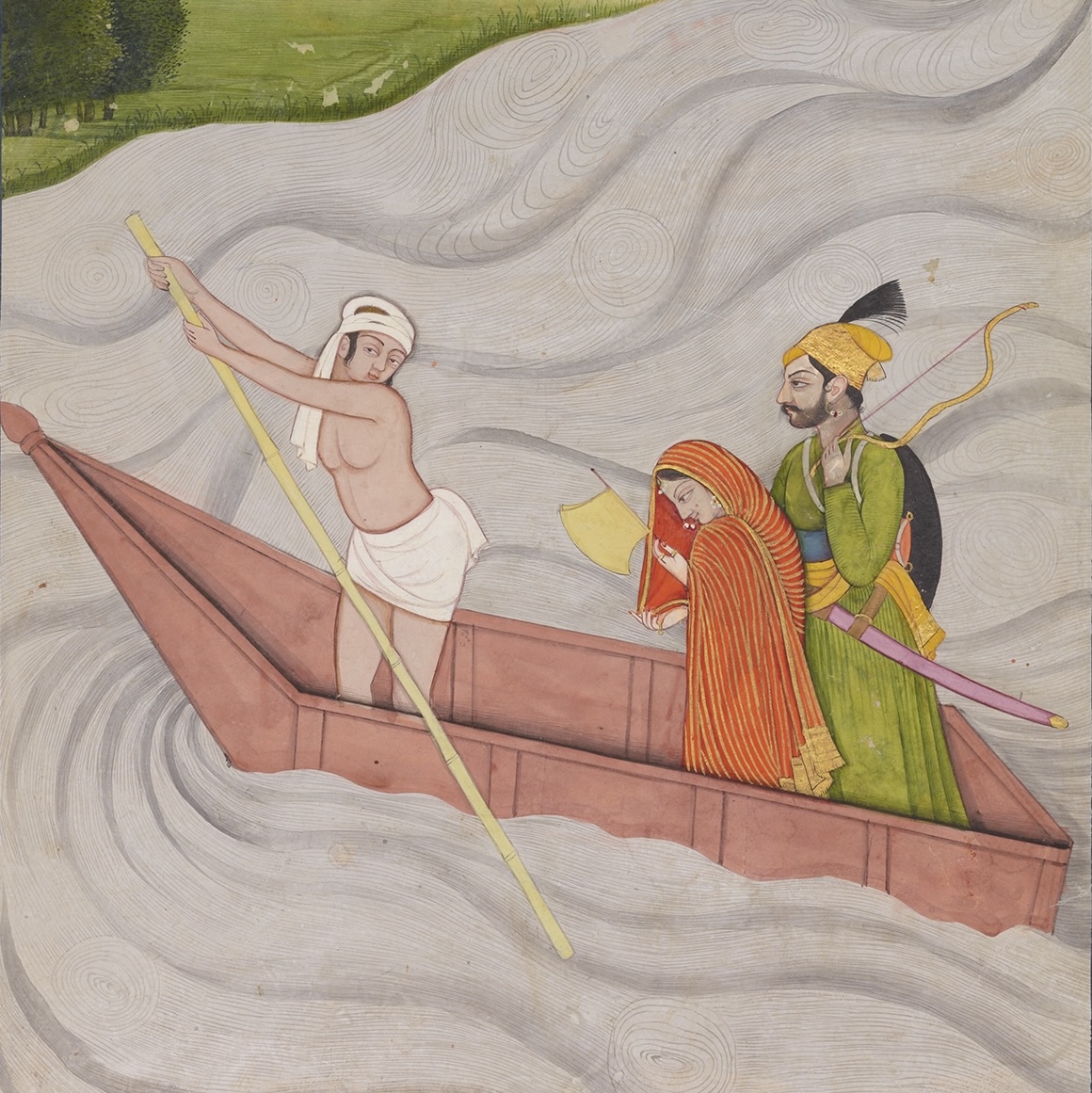 Im Anfangsmotiv des Musikstücks „Ghambira Raga“ fällt der Finger des Sitarspielers von einem silbrig klingenden G zurück auf den Grundton D, um dann einen Moment später zu einem noch höher flirrenden A auszugreifen. Die hübsche melodische Phrase wird mehrfach wiederholt. Wir lauschen ihr, doch welches Bild erzeugen die Klänge in unserem Kopf? Vielleicht denken wir bei den Tonsprüngen an die Bewegung eines Paddels, das am Körper vorbei nach hinten gezogen wird, um dann mit dem nächsten Schlag ein wenig weiter vorne das Wasser des Flusses zu berühren – zurück, vor, zurück, vor. Wir blicken nun auf das Blatt, das auf dem Pult vor uns liegt, und stellen fest: In seiner Miniatur hat der unbekannte Meister, der um 1790 in der Tradition nach Manaku und Nainsukh von Guler arbeitete, exakt diese Szene einer Bootsfahrt über einen Fluss entworfen.