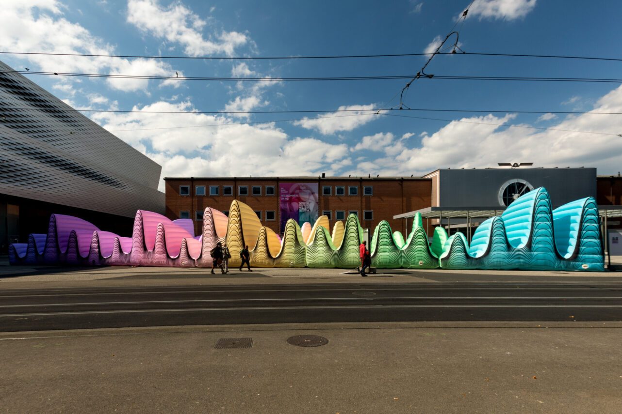 Lightning Symphony der Schweizer Künstlerin Claudia Comte ist eine monumentale aufblasbare Skulptur von 52 Metern neben dem ESC-Village auf dem Messeplatz, die Klang visualisiert und in ein physisches Raumerlebnis verwandelt. Die Installation, die wie wogende Klangwellen geformt ist, erstreckt sich horizontal über den Boden – zwei kolossale Klangwellen, die greifbar werden – und bildet einen begehbaren Korridor, der die Besucher einlädt, die Architektur der Musik selbst zu betreten.