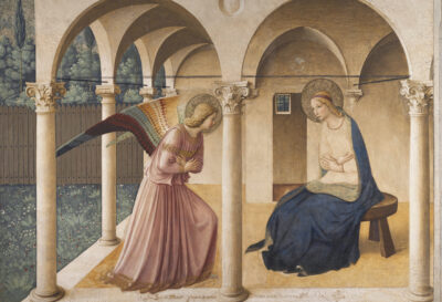 Zeitlich machen Dante und Petrarca als Wegbereiter der Renaissance mit illustrierten Prunkhandschriften aus dem 15. Jahrhundert den Auftakt. Einen Perspektivwechsel bieten Holzintarsien mit Stadtansichten. In jener Zeit tun sich die Hintergründe der Bilder mit einem Blick in die Landschaft auf. Unter dem Motto „Christus – menschlich und göttlich (Verzehrt euch selbst vor dem Bild meines Antlitzes)“ veranschaulicht Andrea Mantegnas erschütterndes Brustbild den leidend-entrückten „Erlöser“ aus dem Museo Correggio wie kein Zweiter. Dass auch Frauen in jener Epoche „gelehrt und fromm“ sein konnten, drückt die „Annunziata“ des Antonello de Saliba aus der Accademia in Venedig aus – eine um 1480/90 entstandene Kopie nach dem weltberühmten Gemälde des Antonello da Messina. Es stellt die Madonna mit dem blauen Schleier am Pult vor einem aufgeschlagenen Buch dar, während sie mit ihren lebhaften Händen gleichsam den Text zu erläutern scheint.